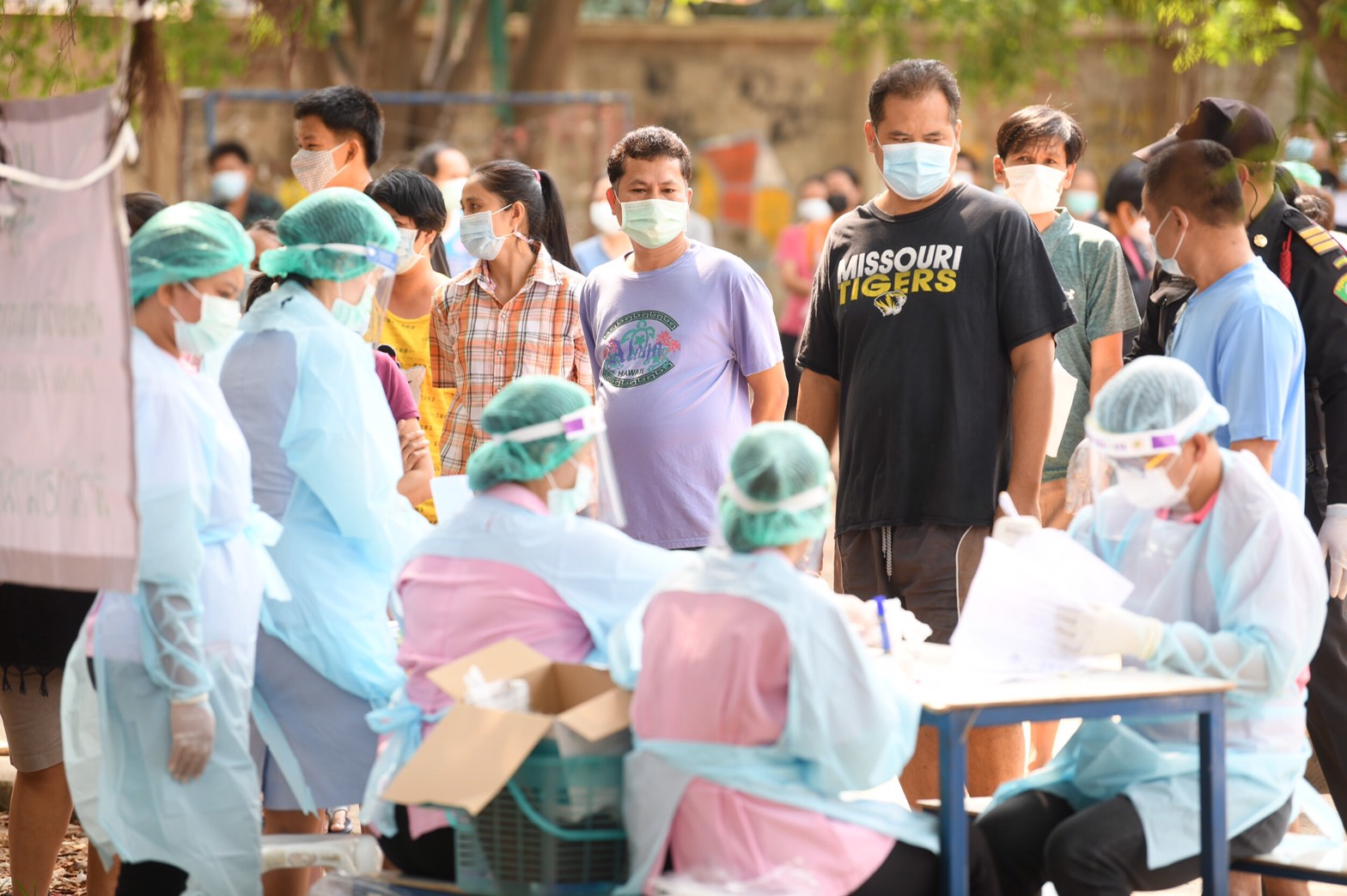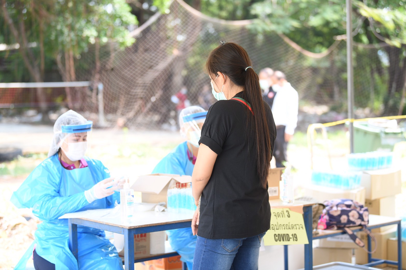 ซึ่งได้แบ่งทีมตรวจออกเป็น 2 ทีม โดยได้รับพระกรุณาธิคุณจากพระบาทสมเด็จพระเจ้าอยู่หัว พระราชทานรถเก็บตัวอย่างชีวนิรภัย จำนวน 2 คัน และเจ้าหน้าที่จากโรงพยาบาล PMG ซึ่งเป็นโรงพยาบาลในพื้นที่ ร่วมเก็บตัวอย่างส่งตรวจหาเชื้อ สามารถรองรับการตรวจหาเชื้อได้ประมาณ 1,000 คน/วัน