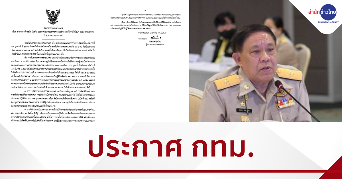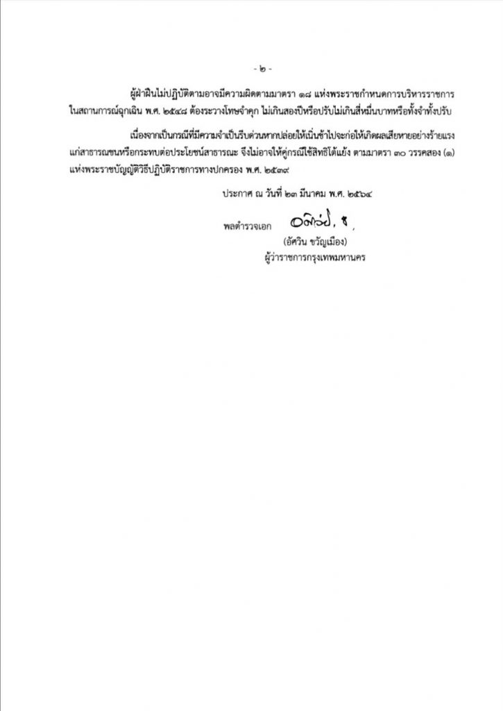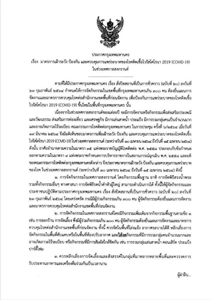 กรุงเทพฯ 23 มี.ค.-กทม. ออกประกาศควบคุมการแพร่ระบาดโควิด-19 ในช่วงเทศกาลสงกรานต์ 10 – 15 เมษายน 2564