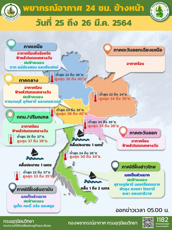 กรมอุตุนิยมวิทยา พยากรณ์อากาศ 24 ชั่วโมงข้างหน้า ความกดอากาศต่ำเนื่องจากความร้อนปกคลุมประเทศไทยตอนบน ทำให้บริเวณดังกล่าวมีอุณหภูมิสูงขึ้น กับมีอากาศร้อนถึงร้อนจัดบางพื้นที่ในภาคเหนือและภาคกลาง ประกอบกับลมใต้และลมตะวันออกเฉียงใต้พัดนำความชื้นจากทะเลจีนใต้และอ่าวไทยเข้ามาปกคลุมภาคเหนือ และภาคกลาง ทำให้บริเวณดังกล่าวมีฝนฟ้าคะนองบางแห่ง