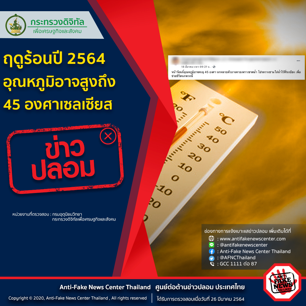 Anti-Fake News Center Thailand ศูนย์ต่อต้านข่าวปลอม ประเทศไทย แจ้งเตือนผ่าน LINE Official Account กรณีข้อความที่แชร์ว่า หน้าร้อนในปีนี้(2564) อุณหภูมิจะสูงถึง 45 องศาเซลเซียสนั้น กรมอุตุนิยมวิทยา กระทรวงดิจิทัลเพื่อเศรษฐกิจและสังคม ได้ตรวจสอบและชี้แจงว่า การคาดหมายลักษณะอากาศช่วงฤดูร้อนของประเทศไทย พ.ศ. 2564 ฤดูร้อนของประเทศไทยปีนี้คาดว่า จะเริ่มในช่วงปลายเดือนกุมภาพันธ์ ซึ่งช้ากว่าปกติ 1 – 2 สัปดาห์และจะสิ้นสุดในช่วงกลางเดือนพฤษภาคม ส่วนลักษณะอากาศจะไม่ร้อนอบอ้าวมาก โดยจะมีอากาศร้อนอบอ้าวเป็นระยะๆ และมีอากาศร้อนจัดบางแห่งในบางช่วง สลับกับจะมีฝนฟ้าคะนองหลายพื้นที่ อุณหภูมิสูงสุดเฉลี่ยประเทศไทยตอนบนประมาณ 35 องศาเซลเซียส ซึ่งจะใกล้เคียงค่าปกติ (ค่าปกติ 35.4 องศาเซลเซียส) แต่จะต่ำกว่าปีที่แล้ว (ช่วงฤดูร้อนปี พ.ศ. 2563 อุณหภูมิสูงสุดเฉลี่ย 36.1 องศาเซลเซียส) ส่วนปริมาณฝนรวมเฉลี่ยจะมากกว่าค่าปกติร้อยละ 10 – 20
