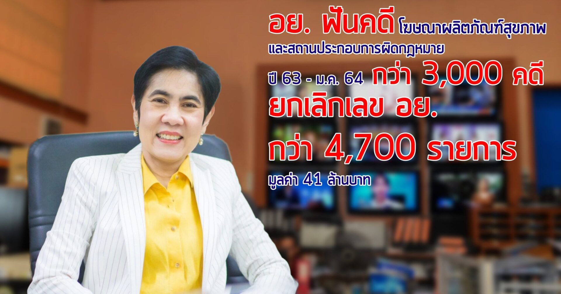 อย.30 มี.ค.- อย.โชว์ผลงานฟันคดีโฆษณา ผลิตภัณฑ์สุขภาพและสถานประกอบการผิดกฎหมาย กว่า 3,000 คดี ค่าปรับ 41 ล้านบาท ยกเลิกเลข อย. กว่า 4,700 รายการ