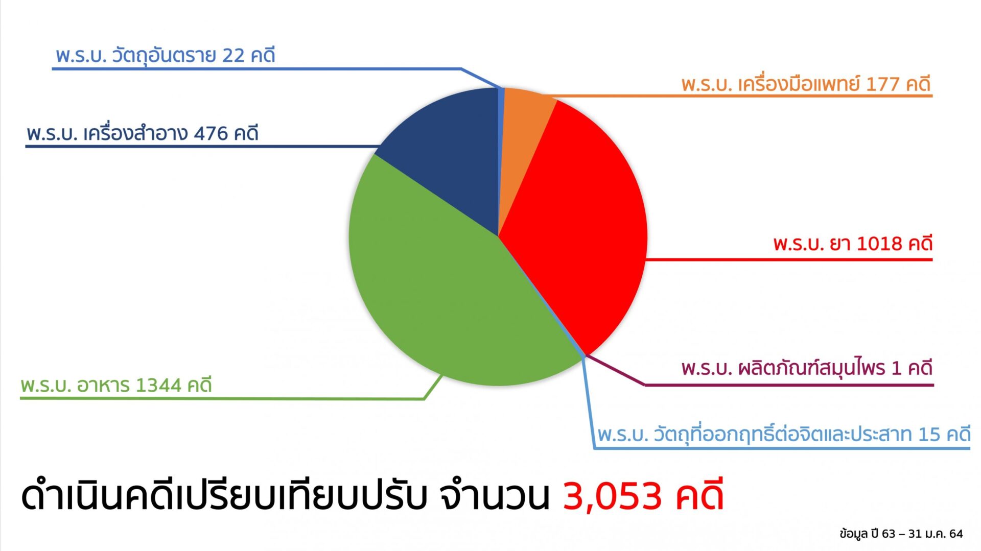 2.เปรียบเทียบปรับผู้กระทำความผิด ทั้งคดีโฆษณา ผลิตภัณฑ์และสถานประกอบการ 3,053 คดี รวมเป็นเงินค่าปรับ 41,429,250 บาท และส่งเจ้าหน้าที่ตำรวจดำเนินการตามกฎหมาย 446 คดี