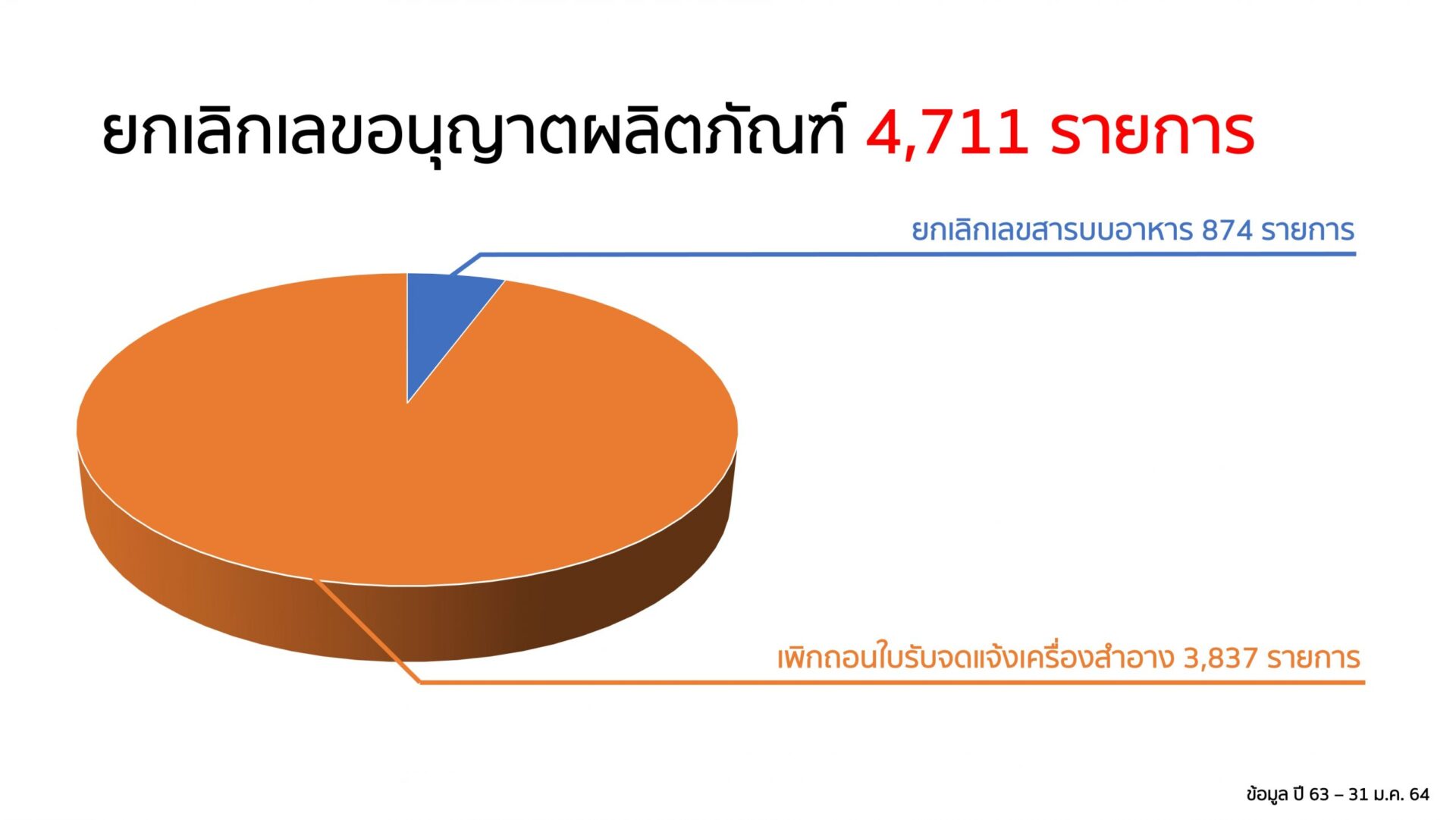 3.ออกคำสั่งทางปกครอง โดยยกเลิกเลขสารบบอาหาร 874 รายการ ด้วยสาเหตุ เช่น โฆษณาแสดงสรรพคุณเป็นเท็จ หลอกลวงให้หลงเขื่อโดยไม่สมควร ในเรื่องการบำบัด บรรเทา รักษาโรค, การปลอมปนยาแผนปัจจุบัน เช่น ไซบูทรามีน ซิลเดนาฟิล, เป็นผลิตภัณฑ์อาหารปลอมหรืออาหารไม่บริสุทธิ์ และสถานที่ผลิต นำเข้า มีสภาพร้าง เป็นต้น และเพิกถอนใบรับจดแจ้งเครื่องสำอาง 3,837 รายการ ด้วยเหตุจากการผลิตเครื่องสำอางไม่ตรงตามที่จดแจ้ง หรือไม่มีสภาพเป็นสถานที่ผลิตเครื่องสำอาง