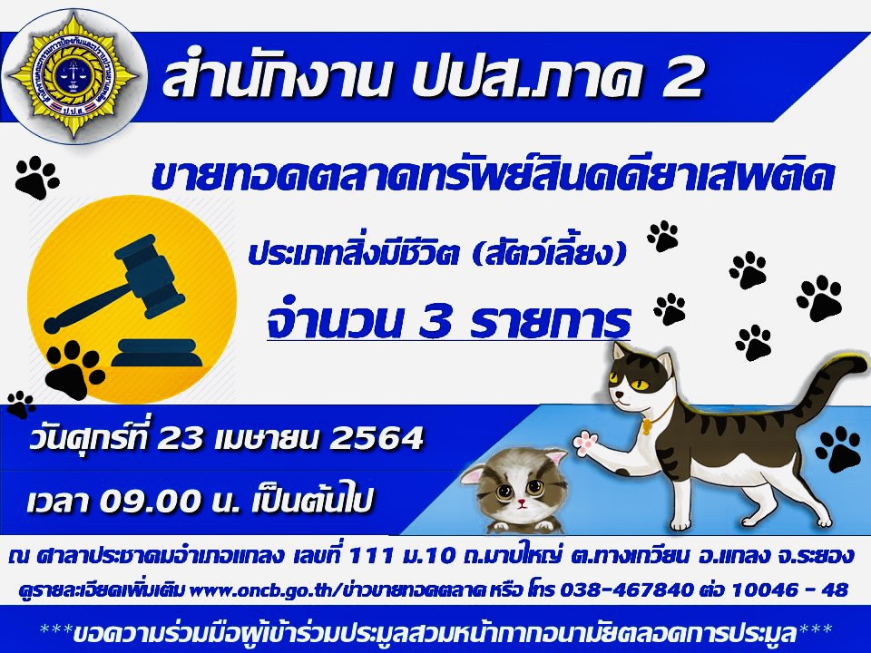 ป.ป.ส. 31 มี.ค.- ป.ป.ส.ประกาศขายทอดตลาดแมว 6 ตัว ของกลางยาเสพติด เครือข่าย “กุ๊ก ระยอง” ที่ จ.ระยอง 23 เม.ย.นี้