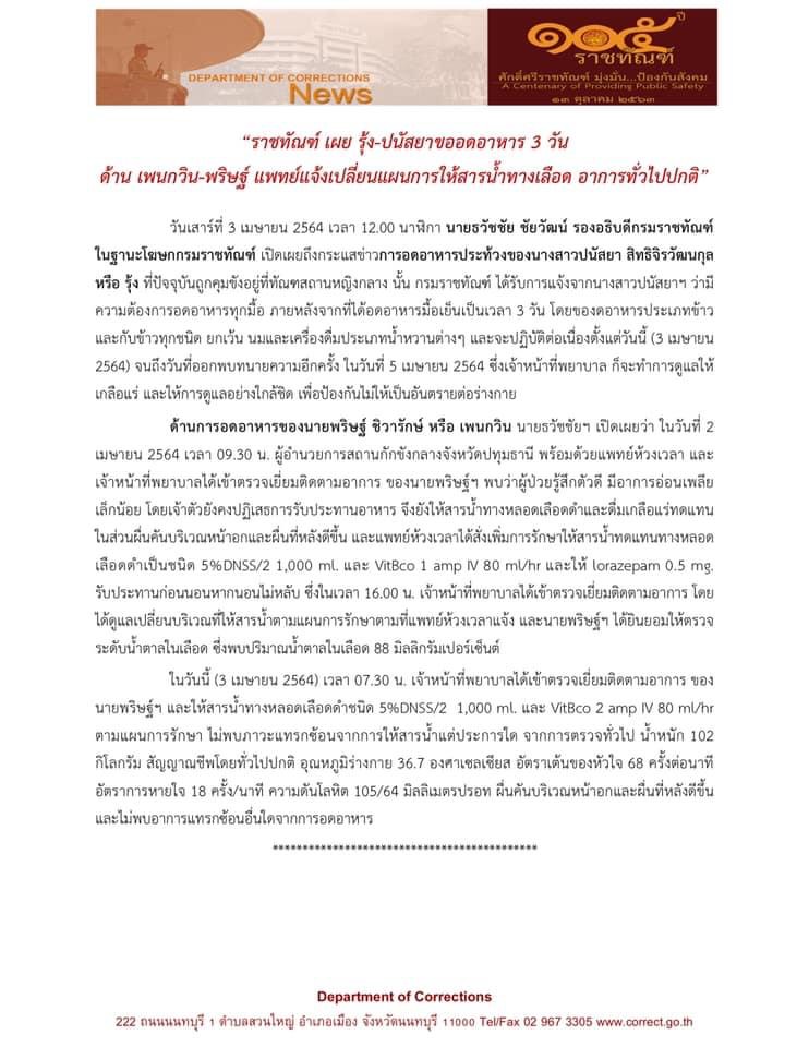 ในวันนี้ (3 เมษายน 2564) เวลา 07.30 น. เจ้าหน้าที่พยาบาลได้เข้าตรวจเยี่ยมติดตามอาการของนายพริษฐ์ และให้สารน้ำทางหลอดเลือดดำชนิด 5% DNSS/2 1,000 ml. และ VitBco 2 amp IV 80 ml/hr ตามแผนการรักษา ไม่พบภาวะแทรกซ้อนจากการให้สารน้ำแต่ประการใด จากการตรวจทั่วไป น้ำหนัก 102 กิโลกรัม สัญญาณชีพโดยทั่วไปปกติ อุณหภูมิร่างกาย 36.7 องศาเซลเซียส อัตราเต้นของหัวใจ 68 ครั้ง/นาที อัตราการหายใจ 18 ครั้ง/นาที ความดันโลหิต 105/64 มิลลิเมตรปรอท ผื่นคันบริเวณหน้าอกและผื่นที่หลังดีขึ้น และไม่พบอาการแทรกซ้อนอื่นใดจากการอดอาหาร. – สำนักข่าวไทย