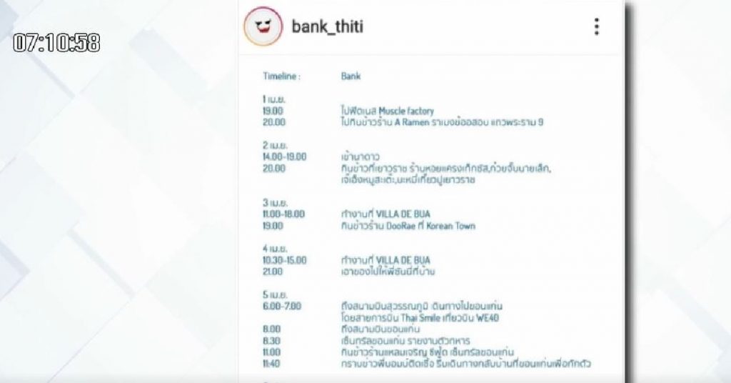 นอกจากนี้แบงค์ ธิติ ได้เปิดเผยไทม์ไลน์ด้วยว่า วันที่ 3-4 เมษายน ได้เดินทางไปทำงานที่ VILLA DE BUA กับพี่ที่รู้จัก และเมื่อพี่ที่รู้จักติดโควิด-19 เมื่อวันที่ 5 เมษายน จากนั้นหลังจากที่แบงค์ ธิติ ไปรายงานตัวเกณฑ์ทหารที่จังหวัดขอนแก่น และกลับกรุงเทพฯ ในวันที่ 6 เมษายน จึงเข้าตรวจหาเชื้อ ซึ่งผลออกมาเมื่อวันที่ 7 เมษายน ช่วงค่ำว่า พบเชื้อโควิด-19 ขณะนี้อยู่ระหว่างกักตัวที่บ้านพัก โดยภาพรวมการเดินทางทั้งหมดใช้รถยนต์ส่วนตัว ยกเว้นการเดินทางจากท่าอากาศยานสุวรรณภูมิไปขอนแก่น ได้โดยสารสายการบิน Thai Smile เที่ยวบิน WE40