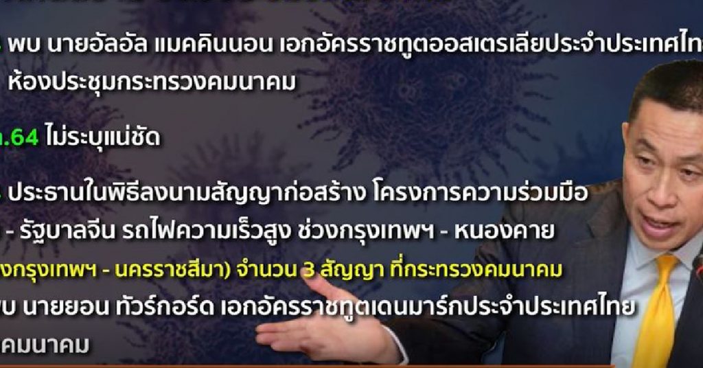 เริ่มจากภารกิจวันที่ 24 มีนาคม เข้าพบกับเอกอัครราชทูตออสเตรเลียประจำประเทศไทย ที่ห้องประชุมกระทรวงคมนาคม จากนั้นวันที่ 29 มีนาคม เป็นประธานในพิธีลงนามสัญญาการก่อสร้างโครงการความร่วมมือระหว่างรัฐบาลไทยกับรัฐบาลจีน ช่วงบ่ายเข้าพบเอกอัครราชทูตเดนมาร์ก ณ กระทรวงคมนาคม