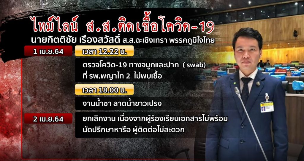 ส่วนกลุ่มนักการเมืองวันนี้มีการเปิดเผยว่า นายกิตติชัย เรืองสวัสดิ์ ส.ส.ฉะเชิงเทรา พรรคภูมิใจไทย ที่พบว่าติดเชื้อโควิด-19 ไทม์ไลน์พบว่าไปหลายที่ ไล่เรียงตั้งแต่