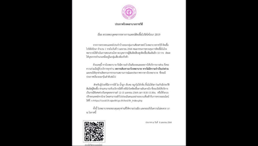 โรงพยาบาลราชวิถี ออกประกาศตรวจพบบุคลากรทางการแพทย์ติดเชื้อโควิด-19 ระบุว่า เมื่อวันที่ 5 เมษายน ตรวจพบแพทย์ประจำบ้านติดเชื้อ 1 คน คณะกรรมการควบคุมการติดเชื้อฯ ได้สอบสวนโรค พบบุคลากรผู้สัมผัสเสี่ยงสูงติดเชื้อเพิ่มเติมอีก 10 คน ส่งผลให้บุคลากรจำนวนหนึ่งอยู่ในกลุ่มเสี่ยงต้องกักตัว โรงพยาบาลจึงจำเป็นต้องงดและลดการให้บริการบางส่วน จึงขอความร่วมมือผู้รับบริการทุกคนงดการเดินทางมาโรงพยาบาล หากไม่มีความจำเป็นเร่งด่วน สำหรับผู้ป่วยที่มีอาการไข้ ไอ น้ำมูก เจ็บคอ จมูกไม่ได้กลิ่น ลิ้นไม่ได้รส ร่วมกับมีประวัติสัมผัสผู้ติดเชื้อ สามารถรับบริการได้ที่คลินิกโรคติดเชื้อทางเดินหายใจ.-สำนักข่าวไทย