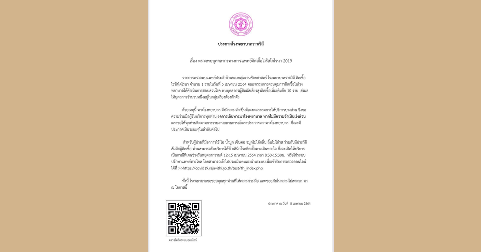 โรงพยาบาลราชวิถี ออกประกาศเรื่อง ตรวจพบบุคลากรทางการแพทย์ติดเชื้อไวรัสโคโรนา 2019 โดยมีรายละเอียดว่า จากการตรวจพบแพทย์ประจําบ้านของกลุ่มงานศัลยศาสตร์ โรงพยาบาลราชวิถี ติดเชื้อ ไวรัสโคโรนา จํานวน 1 รายในวันที่ 5 เมษายน 2564 คณะกรรมการควบคุมการติดเชื้อในโรงพยาบาลได้ดําเนินการสอบสวนโรค พบบุคลากรผู้สัมผัสเสี่ยงสูงติดเชื้อเพิ่มเติมอีก 10 ราย ส่งผลให้บุคลากรจํานวนหนึ่งอยู่ในกลุ่มเสี่ยงต้องกักตัว