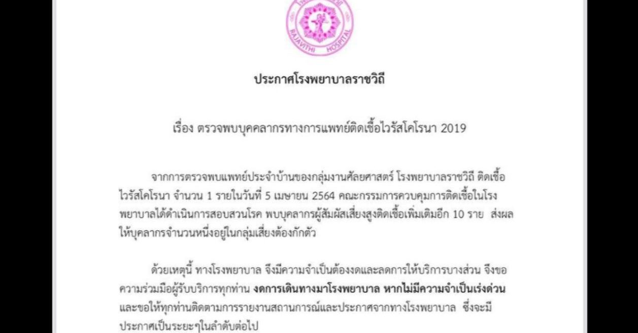 โรงพยาบาลราชวิถี ออกประกาศตรวจพบบุคลากรทางการแพทย์ติดเชื้อ “โควิด-19” ระบุว่า จากการตรวจพบแพทย์ประจําบ้านของกลุ่มงานศัลยศาสตร์ ติดเชื้อ “โควิด-19” 1 คนเมื่อวันที่ 5 เมษายนที่ผ่านมา จากนั้นคณะกรรมการควบคุมการติดเชื้อฯ ได้สอบสวนโรคและพบบุคลากรผู้สัมผัสเสี่ยงสูงติดเชื้อเพิ่มอีก 10 คน ส่งผลให้บุคลากรจำนวนหนึ่งอยู่ในกลุ่มเสี่ยงต้องกักตัว