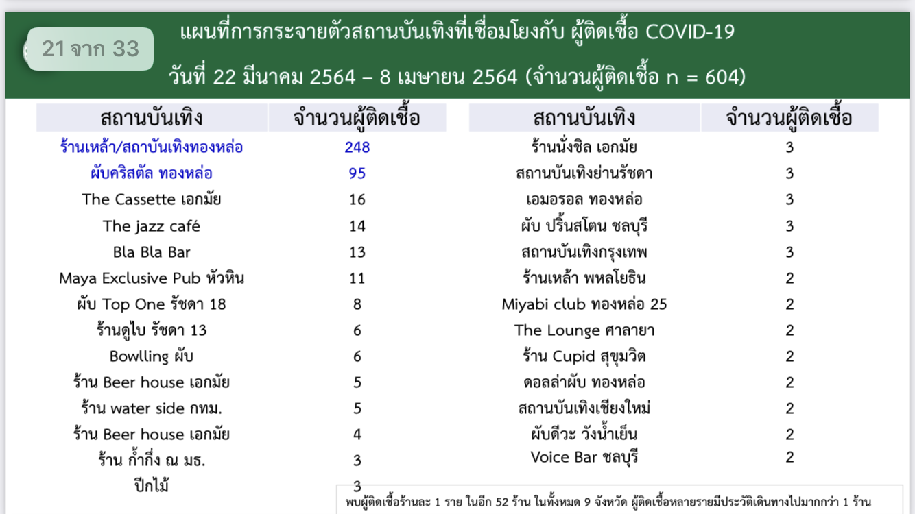 สธ. 9 เม.ย. – สธ.แจงคลัสเตอร์สถานบันเทิงทองหล่อ มีผู้ติดเชื้อ 604 คน กระจายไป 32 จังหวัด มีสถานบันเทิงเกี่ยวข้องรวม 52 แห่ง และเป็นการติดเชื้อไม่แสดงอาการ 62%