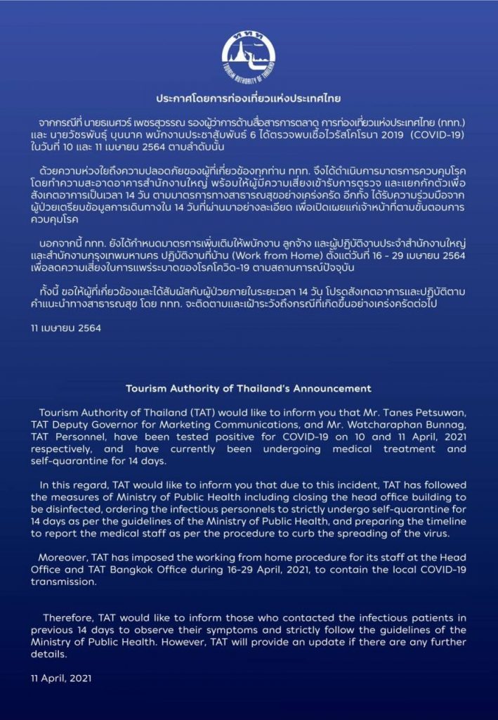 นอกจากนี้ยังมีนายวัชระพันธ์ บุนนาค พนักงานประชาสัมพันธ์ 6 ได้ตรวจพบเชื้อโควิด-19 ในวันที่ 11 เมษายน ด้วยความห่วงใยถึงความปลอดภัยของผู้เกี่ยวข้อง ททท. จึงได้ดำเนินการมาตรการควบคุมโรค โดยทำความสะอาดอาคารสำนักงานใหญ่พร้อมให้ผู้มีความเสี่ยงเข้ารับการตรวจและแยกกักตัวเพื่อสังเกตอาการเป็นเวลา 14 วันตามมาตรการทางสาธารณสุขอย่างเคร่งครัดอีกทั้งได้รับความร่วมมือจากผู้ป่วยเตรียมข้อมูลการเดินทางใน 14 วันที่ผ่านมาอย่างละเอียดเพื่อเปิดเผยแก่เจ้าหน้าที่ตามขั้นตอนควบคุมโรคนอกจากนี้ยังได้กำหนดมาตรการเพิ่มเติมให้พนักงานลูกจ้างและผู้ปฏิบัติงานประจำสำนักงานใหญ่และสำนักงานกรุงเทพฯ ปฏิบัติงานที่บ้าน work from home ตั้งแต่วันที่ 16 -29 เมษายน 2564 เพื่อลดความเสี่ยงในการแพร่ระบาดของโควิด-19 ตามสถานการณ์ปัจจุบัน ทั้งนี้ขอให้ผู้ที่เกี่ยวข้องและได้สัมผัสกับผู้ป่วยในระยะเวลา 14 วันโปรดสังเกตอาการและปฏิบัติตามคำแนะนำทางสาธารณสุข โดย ททท.จะติดตามและเฝ้าระวังถึงกรณีที่เกิดขึ้นอย่างเคร่งครัดต่อไป .-สำนักข่าวไทย