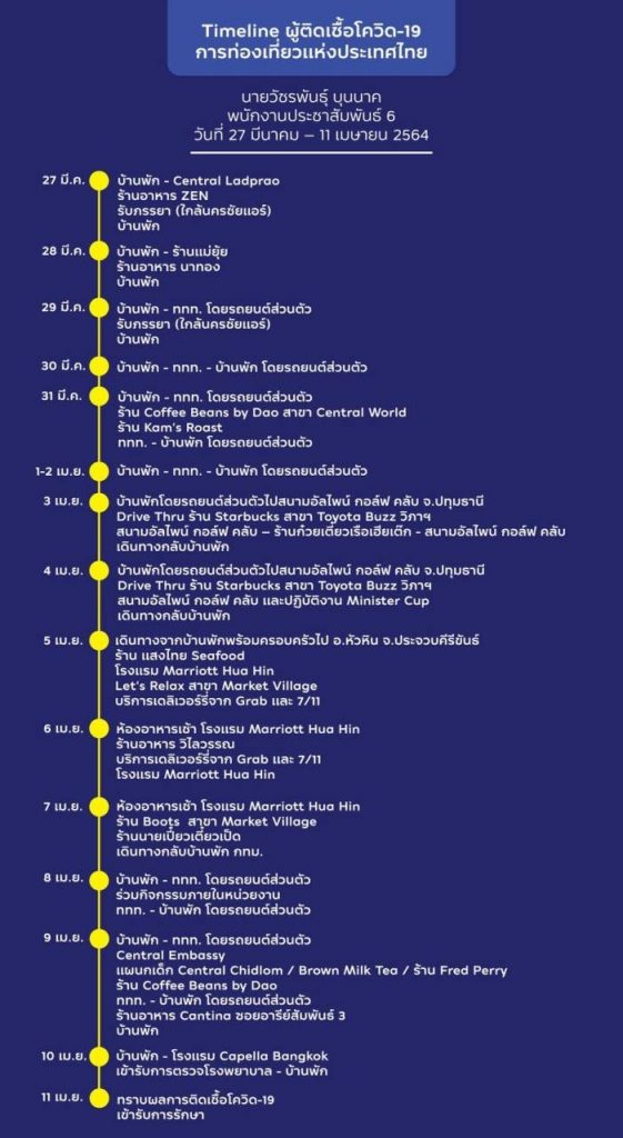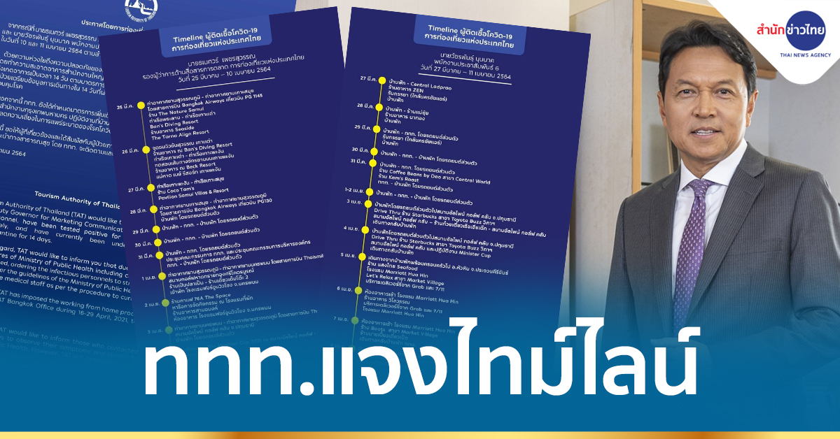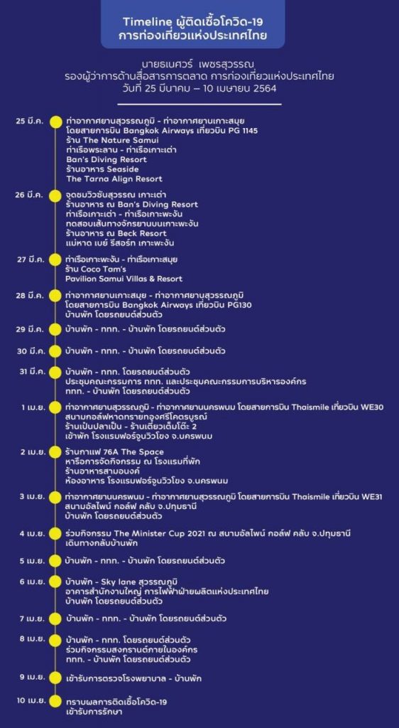 การท่องเที่ยวแห่งประเทศไทย แจงไทม์ไลน์อย่างละเอียด กรณี นายธเนศวร์ เพชรสุวรรณ รองผู้ว่าการด้านสื่อสารการตลาด การท่องเที่ยวแห่งประเทศไทย(ททท.) ตรวจพบการติดเชื้อโควิด-19 เมื่อวันที่ 10 เม.ย.ที่ผ่านมา โดยแจ้งไทม์ไลน์ย้อนหลังไป ตั้งแต่วันที่ 25 มีนาคม 2564 โดยพบว่า วันที่ 25 มี.ค.64 เดินทางไปยังท่าอากาศยานสุวรรณภูมิ – ท่าอากาศยานเกาะสมุย โดยสายการบิน บางกอก แอร์เวย์ เที่ยวบิน PG 1145 ท่าเรือพระลาน-เกาะเต่า วันที่26 มี.ค.64 จุดชมวิวซันสุวรรณ เกาะเต่า ท่าเรือเกาะเต่า-เกาะพะงัน วันที่27 มี.ค.64 ท่าเรือเกาะสมุย วันที่28 มี.ค.64 ท่าอากาศยานเกาะสมุย-สุวรรณภูมิ กลับบ้านพักโดยรถยนต์ส่วนตัว และ 29 – 31 มี.ค.64 บ้านพัก ททท. 1 เม.ย.64 ท่าอากาศยานสุวรรณภูมิ-นครพนม 2 เม.ย.โรงแรมฟอร์จูนวิวโขง จ.นครพนม 3 เม.ย.64 ท่าอากาศยานนครพนม-สุวรรณภูมิ สนามอัลไพน์ กอล์ฟ คลับ จ.ปทุมธานี 4 เม.ย.64 ร่วมกิจกรรม the Minister Cup 2021 ที่ สนามอัลไพน์ กอล์ฟ คลับ จ.ปทุมธานี 5 เม.ย.64 ททท.บ้านพัก 6 เม.ย.64 บ้านพัก sky lane สุวรรณภูมิ อาคารสำนักงานใหญ่ การไฟฟ้าฝ่ายผลิตแห่งประเทศไทย 7-8 เม.ย.64 บ้านพัก 9 เม.ย.64 เข้ารับการตรวจ และ10 เม.ย.64 ทราบผลติดเชื้อ และเข้ารับการรักษา
