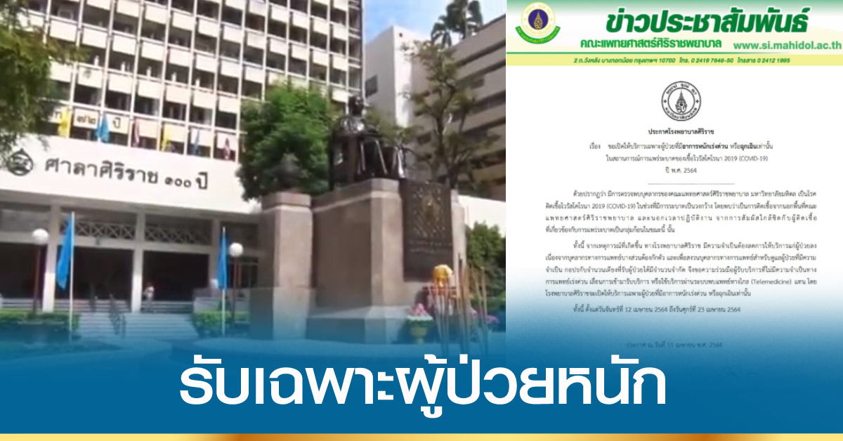 ประกาศโรงพยาบาลศิริราช เรื่อง ขอเปิดให้บริการเฉพาะผู้ป่วยที่มีอาการหนักเร่งด่วน หรือฉุกเฉินเท่านั้น ในสถานการณ์การแพร่ระบาดของเชื้อไวรัสโคโรนา 2019 (COVID-19) ปี พ.ศ. 2564