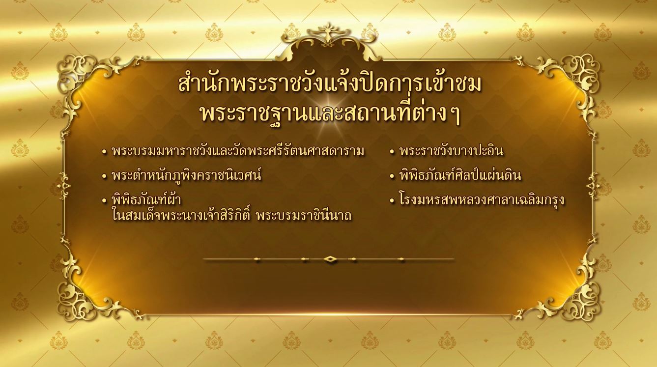 สำนักพระราชวัง ขอแจ้งปิดการเข้าชมพระราชฐานและสถานที่ต่าง ๆ ดังนี้