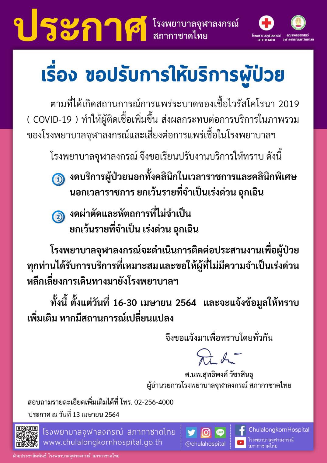 ดังนั้น โรงพยาบาลจุฬาลงกรณ์ จึงขอเรียนปรับงานบริการให้ทราบ และแจ้ง ดังนี้