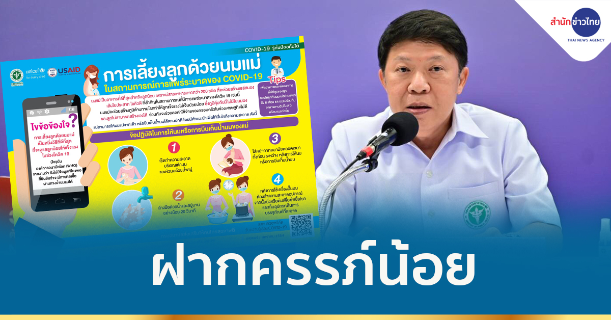 ทางด้าน นายแพทย์เอกชัย เพียรศรีวัชรา ผู้อำนวยการสำนักส่งเสริมสุขภาพ และโฆษกกรมอนามัย กล่าวว่า กรณีหญิงตั้งครรภ์ที่เข้าข่ายสงสัยติดเชื้อหรือได้รับการยืนยันว่าติดเชื้อโควิด-19 สามารถให้นมลูกได้หรือไม่นั้น จากข้อมูลขณะนี้ยังไม่มีหลักฐานยืนยันว่าเชื้อโควิด-19 สามารถติดผ่านทางรกหรือทางน้ำนมได้ กรณีแม่เป็นผู้เข้าข่ายสงสัยติดเชื้อหรือได้รับการยืนยันว่าติดเชื้อโควิด-19 จึงสามารถให้นมลูกได้ โดยองค์การอนามัยโลก (WHO) และองค์การทุนเพื่อเด็กแห่งสหประชาชาติ (UNICEF) มีคำแนะนำว่า หากแม่ที่ติดเชื้อมีอาการไม่มากสามารถให้นมจากเต้าได้ก็ควรทำ แต่ต้องมีการป้องกันการแพร่กระจายของเชื้ออย่างเคร่งครัด โดยก่อนให้นมลูกทุกครั้งควรเช็ดทำความสะอาดบริเวณเต้านมและหัวนมด้วยน้ำสบู่ และล้างมือด้วยสบู่และน้ำอย่างน้อย 20 วินาที รวมทั้งสวมหน้ากากตลอดเวลาที่ให้นมบุตร ห้ามใช้มือสัมผัสบริเวณใบหน้า จมูกหรือปาก รวมถึงการหอมแก้มลูกด้วย แต่ในกรณีที่แม่ติดเชื้อมีอาการรุนแรง เช่น ไอมาก แต่ยังสามารถบีบเก็บน้ำนมได้ ควรให้พ่อหรือผู้ช่วย เป็นผู้ป้อนนมแก่ลูกแทน ซึ่งการบีบน้ำนมอย่างสม่ำเสมอจะช่วยให้แม่ยังคงสภาพในการให้นมแก่ลูกได้เมื่อหายป่วยแล้ว ส่วนทารกที่เกิดจากแม่ที่ติดเชื้อโควิด-19 จัดเป็นผู้มีความเสี่ยงจะต้องมีการแยกตัวออกจากทารกอื่นและต้องสังเกตอาการเป็นเวลา 14 วัน.-สำนักข่าวไทย