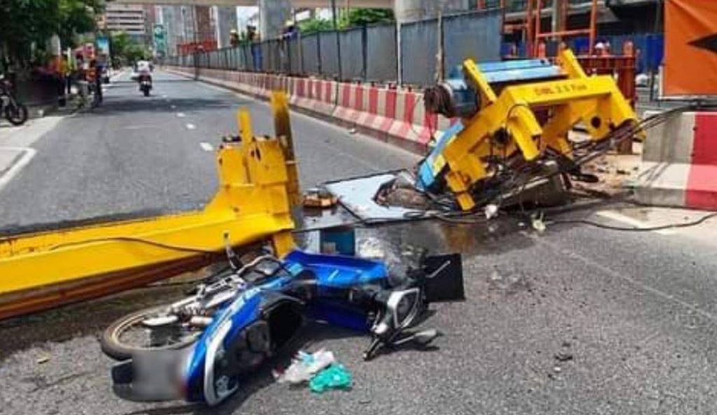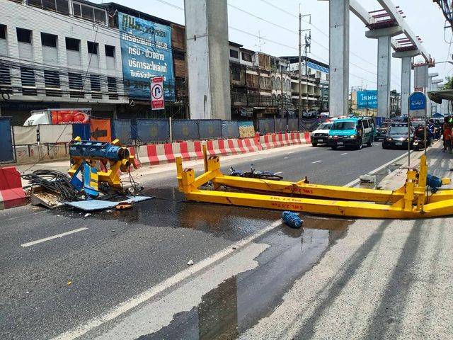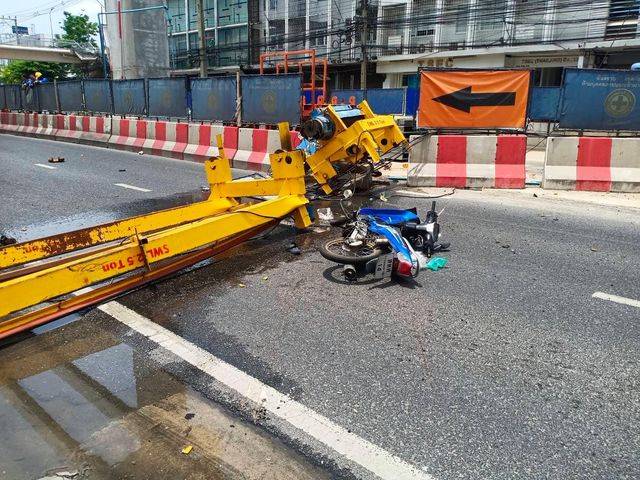ทั้งนี้ จุดเกิดเหตุดังกล่าวเป็นพื้นที่แนวก่อสร้างโครงการรถไฟฟ้าสายสีเหลือง ช่วงลาดพร้าว-สำโรง ที่การรถไฟฟ้าขนส่งมวลชนแห่งประเทศไทย ( รฟม. ) กระทรวงคมนาคม รับผิดชอบกำกับดูแล โดยจากการชี้แจงข้อเท็จจริงและจากการตรวจสอบเบื้องต้น พบว่าบริษัท ผู้รับสัมปทานโครงการฯ ได้นำอุปกรณ์สำหรับยกติดตั้งทางเดินฉุกเฉิน (Emergency Walkway) ระหว่างคานทางวิ่ง (Guideway Beam) มาติดตั้งในช่วงก่อนเทศกาลสงกรานต์แต่การติดตั้งยังไม่แล้วเสร็จ จึงได้ดำเนินการติดตั้งต่อไปอย่างต่อเนื่องให้แล้วเสร็จ ซึ่งขณะติดตั้งได้เกิดเหตุสายสลิงยกของขาดทำให้เกิดแรงสะบัดส่งผลให้แขนเครนยกของร่วงหล่นลงบนถนนศรีนครินทร์ฝั่งขาออก ทำให้ชิ้นส่วนดังกล่าวกระเด็นใส่รถจักรยานยนต์ ทำให้มีผู้ได้รับบาดเจ็บ 1 ราย เข้ารักษาตัวที่โรงพยาบาลลาดพร้าว ส่วนรถจักรยานยนต์ได้รับความเสียหาย 1 คัน โดยในทางคดีเจ้าหน้าที่ตำรวจ สน.หัวหมากจะเป็นผู้ดำเนินการ ซึ่ง บริษัทผู้รับสัมปทานจะเป็นผู้รับผิดชอบความเสียหายทั้งหมด ส่วนทรัพย์สินของทางราชการไม่ได้รับความเสียหายแต่อย่างใด .-สำนักข่าวไทย