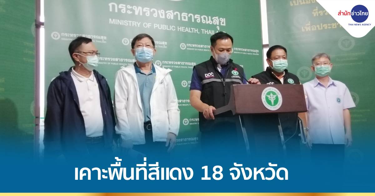 สำหรับพื้นที่สีแดงควบคุมสูงสุดมีทั้งหมด18 จังหวัด ประกอบด้วย กรุงเทพมหานคร เชียงใหม่ ชลบุรี สมุทรปราการ ประจวบคีรีขันธ์ สมุทรสาคร ปทุมธานี นครปฐม ภูเก็ต นครราชสีมา นนทบุรี สงขลา ตาก อุดรธานี สุพรรณบุรี สระแก้ว ระยอง และขอนแก่น.-สำนักข่าวไทย