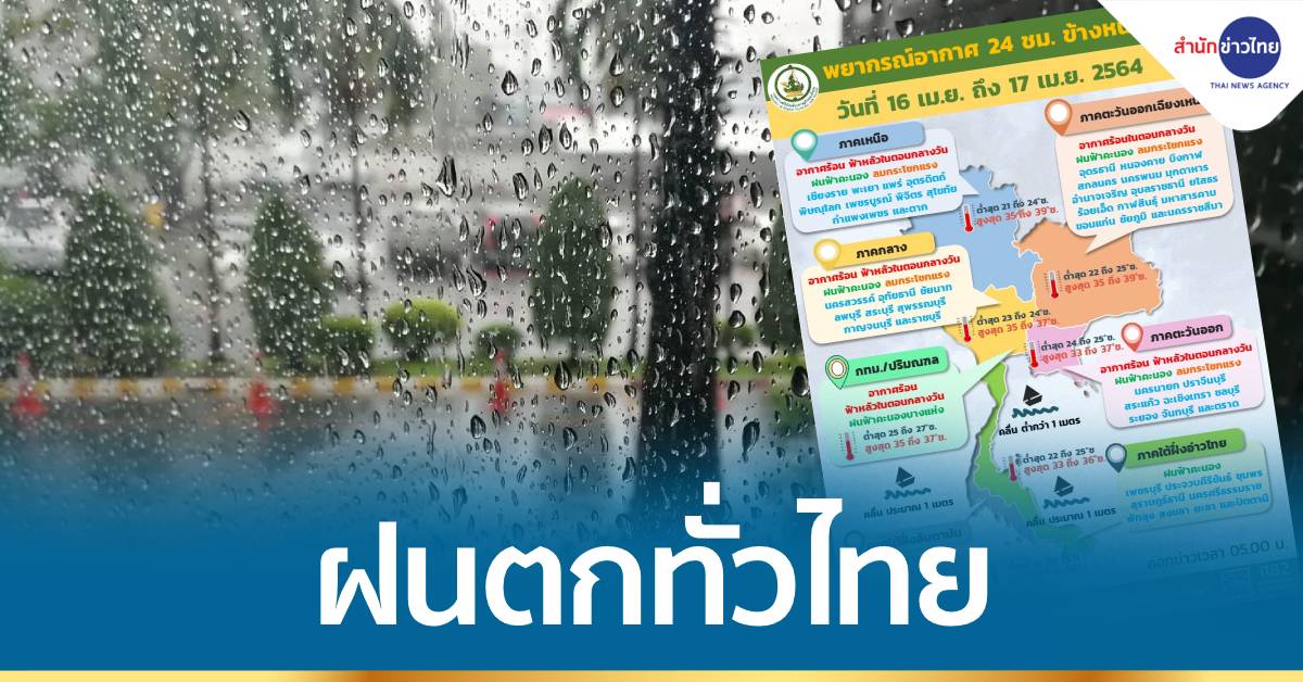 กรุงเทพฯ 16 เม.ย.-กรมอุตุฯ เผยหลายพื้นที่ทั่วไทยฝนฟ้าคะนอง ลมกระโชกแรง ลูกเห็บตกบางแห่ง ขณะที่ กทม.-ปริมณฑล ฝนตก 30% อากาศร้อนกับฟ้าหลัวตอนกลางวัน