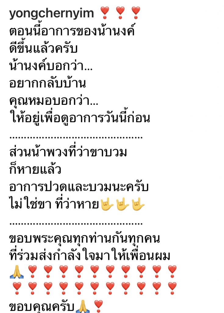 กรุงเทพฯ 16 เม.ย.-โย่ง เชิญยิ้ม โพสต์ล่าสุด น้านงค์ ที่เผลอดื่มน้ำยาล้างจานเข้าไปอาการดีขึ้นแล้วอยากกลับบ้าน แต่หมอขอให้อยู่ดูอาการก่อน ส่วนน้าพวงเพื่อนร่วมคณะตลกอีกคนที่ขาบวมก็หายแล้วเช่นกัน