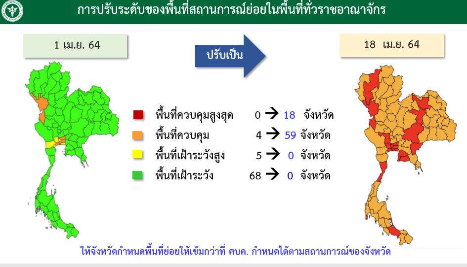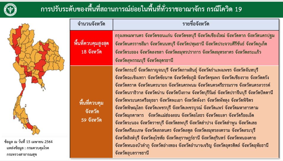 1.พื้นควบคุมสูงสุด (สีแดง) จำนวน 18 จังหวัด ประกอบด้วย กรุงเทพฯ เชียงใหม่ ชลบุรี สมุทรปราการ ประจวบคีรีขันธ์ สมุทรสาคร ปทุมธานี นครปฐม ภูเก็ต นครราชสีมา นนทบุรี สงขลา ตาก อุดรธานี สุพรรณบุรี สระแก้ว ระยอง ขอนแก่น