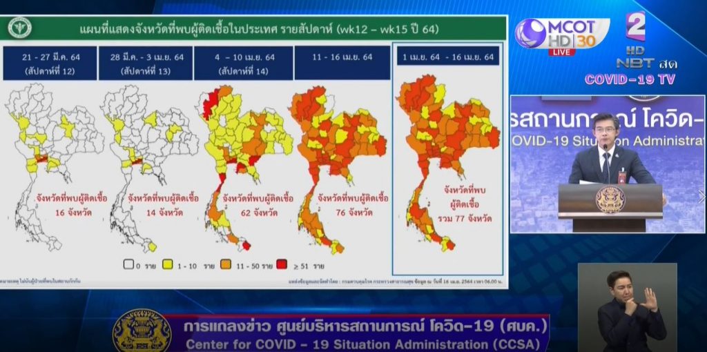 นพ.ทวีศิลป์ วิษณุโยธิน โฆษก ศบค. แถลงเพื่อเพิ่มประสิทธิภาพลดการแพร่เชื้อโควิด-19 หลังเชื้อกระจายไปทั่วประเทศ 77 จังหวัด คณะกรรมการบริหารสถานการณ์การแพร่ระบาดของโรคติดเชื้อไวรัสโคโรนา 2019 ยกระดับมาตรการป้องกันโควิดของทุกจังหวัด จัดกลุ่มจังหวัดพื้นที่ควบคุมออกเป็น 2 กลุ่ม ได้แก่ พื้นควบคุมสูงสุด (สีแดง) จำนวน 18 จังหวัด และพื้นที่ควบคุม (สีส้ม) 59 จังหวัด โดยให้ปิดสถานบันเทิง ลดเคลื่อนย้าย ปรับเวลาเปิด-ปิดห้างร้าน ให้ปฏิบัติตามมาตรการพื้นที่สี