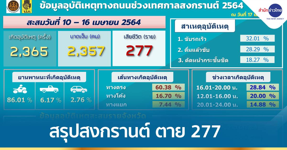 กทม. 17 เม.ย.-ศปถ.สรุป 6 วันสงกรานต์ เกิดอุบัติเหตุรวม 2,365 ครั้ง ผู้เสียชีวิตรวม 277 ราย ผู้บาดเจ็บ 2,357 คน สาเหตุหลักเมาแล้วขับและขับรถเร็ว