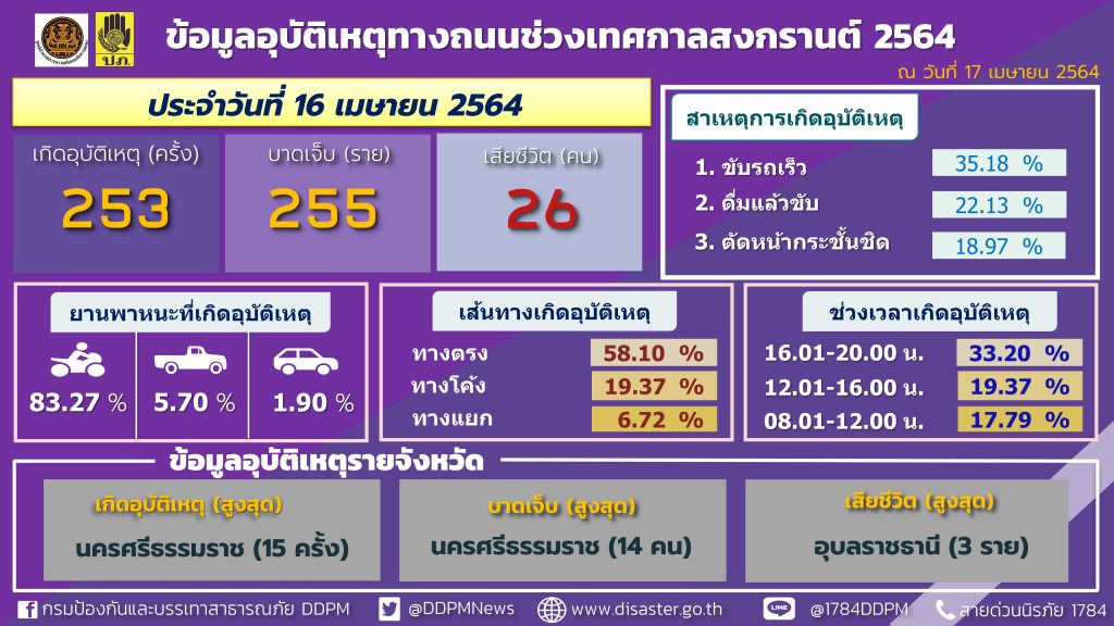 นายอรรษิษฐ์ สัมพันธรัตน์ รองปลัดกระทรวงมหาดไทย ในฐานะประธานคณะอนุกรรมการเฉพาะกิจศูนย์อำนวยการป้องกันและลดอุบัติเหตุทางถนนตลอดทั้งปี เปิดเผยว่า ศูนย์อำนวยการป้องกันและลดอุบัติเหตุทางถนนช่วงเทศกาลสงกรานต์ พ.ศ. 2564 โดยกรมป้องกันและบรรเทาสาธารณภัยและความร่วมมือของหน่วยงานภาคีเครือข่ายได้รวบรวมสถิติอุบัติเหตุทางถนนประจำวันที่ 16 เมษายน 2564 ซึ่งเป็นวันที่เจ็ดของการรณรงค์ “สงกรานต์สุขใจ ขับขี่ปลอดภัย ห่างไกลโควิด” เกิดอุบัติเหตุ 253 ครั้ง ผู้เสียชีวิต 26 ราย ผู้บาดเจ็บ 255 คน สาเหตุที่ทำให้เกิดอุบัติเหตุสูงสุด ได้แก่ ขับรถเร็ว ร้อยละ 35.18 ดื่มแล้วขับ ร้อยละ 22.13 ยานพาหนะที่เกิดอุบัติเหตุสูงสุด ได้แก่ รถจักรยานยนต์ ร้อยละ 83.27 ส่วนใหญ่เกิดบนเส้นทางตรง ร้อยละ 58.10 ถนนกรมทางหลวง ร้อยละ 39.13 ถนนใน อบต./หมู่บ้าน ร้อยละ 37.15 ช่วงเวลาที่เกิดอุบัติเหตุสูงสุด ได้แก่ ช่วงเวลา 16.01-20.00 น. ร้อยละ 33.20 ผู้บาดเจ็บและเสียชีวิตสูงสุด อยู่ในช่วงอายุ 60 ปีขึ้นไป ร้อยละ 17.79 ทั้งนี้ ได้จัดตั้งจุดตรวจหลัก 1,908 จุด เจ้าหน้าที่ปฏิบัติงาน 59,389 คน เรียกตรวจยานพาหนะ 316,725 คัน มีผู้ถูกดำเนินคดี รวม 65,549 ราย มีความผิดฐานไม่มีใบขับขี่ 15,631 ราย ไม่สวมหมวกนิรภัย 15,201 ราย