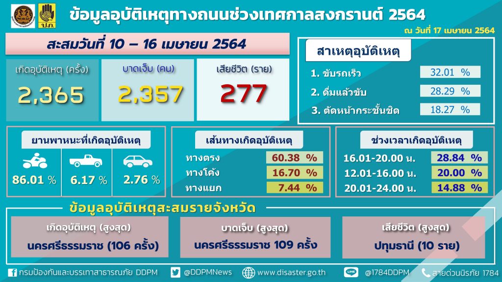 สรุปอุบัติเหตุทางถนนสะสมในช่วง 6 วันของการรณรงค์ (10-16 เม.ย. 64) เกิดอุบัติเหตุรวม 2,365 ครั้ง ผู้เสียชีวิตรวม 277 ราย ผู้บาดเจ็บ รวม 2,357 คน จังหวัดที่ไม่มีผู้เสียชีวิต (ตายเป็นศูนย์) มี 5 จังหวัด จังหวัดที่เกิดอุบัติเหตุสะสมสูงสุดได้แก่ นครศรีธรรมราช (106 ครั้ง) จังหวัดที่มีผู้เสียชีวิตสะสมสูงสุด ปทุมธานี (10 ราย) จังหวัดที่มีผู้บาดเจ็บสะสมสูงสุด ได้แก่ นครศรีธรรมราช (109 คน) ท้ายนี้ ศปถ. ขอขอบคุณหน่วยงานทุกภาคส่วน เครือข่ายอาสาสมัคร กลุ่มจิตอาสา และเจ้าหน้าที่ผู้ปฏิบัติงานที่ร่วมเป็นส่วนหนึ่งในการอำนวยความสะดวกและสร้างความปลอดภัยแก่ประชาชนในการเดินทาง ด้วยความทุ่มเท เสียสละ อดทน และเข้มแข็ง