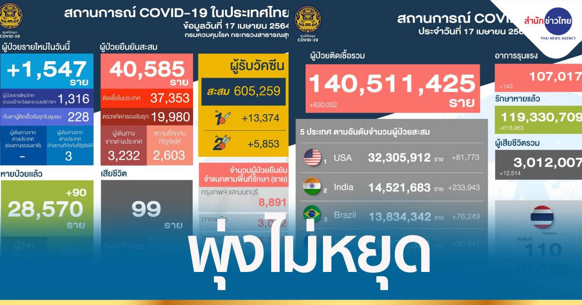 กทม. 17 เม.ย. – โฆษก ศบค.เผยยอดติดเชื้อพุ่งต่อเนื่อง ป่วยโควิดเพิ่มวันนี้ 1,547 ราย เสียชีวิตเพิ่ม 2 ราย
