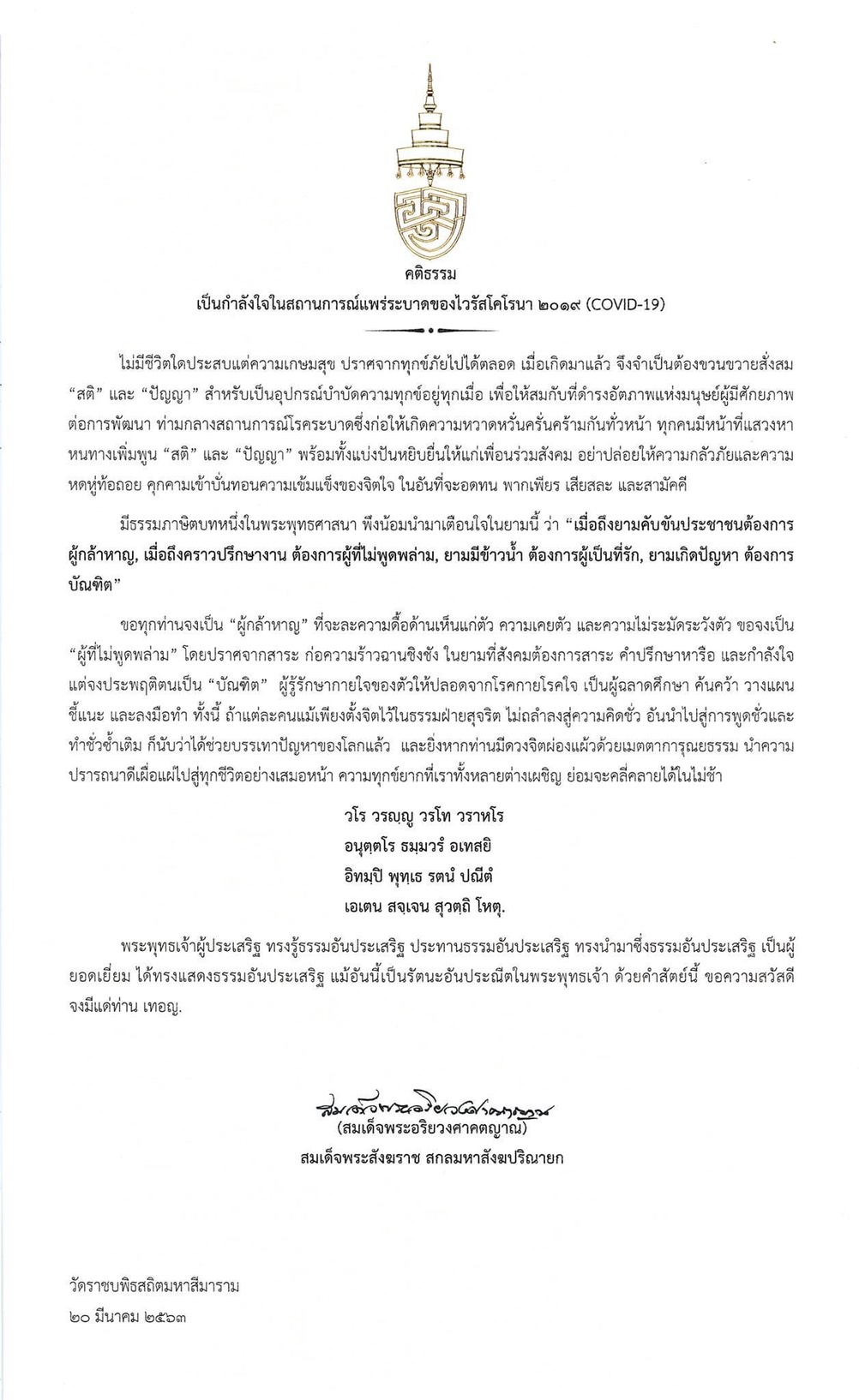 รัฐมนตรีประจำสำนักนายกรัฐมนตรี กล่าวว่า ในสถานการณ์เช่นนี้ ประชาชนมักเดินทางเข้าวัด ซึ่งเป็นสถานที่ยึดเหนี่ยวจิตใจมาช้านาน โดยเฉพาะในช่วงเทศกาลสำคัญต่างๆ จึงขอความร่วมมือประชาชนปฏิบัติตามมาตรการของรัฐ และประกาศของทางวัดที่จะเดินทางไปอย่างเคร่งครัด และขอให้ยึดถือพระคติธรรมที่สมเด็จพระอริยวงศาคตญาณ สมเด็จพระสังฆราช ทรงประทานเพื่อเป็นกำลังใจในสถานการณ์แพร่ระบาดของไวรัสโคโรนา (COVID-19) ความตอนหนึ่งว่า “ท่ามกลางสถานการณ์โรคระบาดซึ่งก่อให้เกิดความหวาดหวั่นครั่นคร้ามกันทั่วหน้า ทุกคนมีหน้าที่แสวงหาหนทางเพิ่มพูน “สติ” และ “ปัญญา” พร้อมทั้งแบ่งปันหยิบยื่นให้แก่เพื่อนร่วมสังคม อย่าปล่อยให้ความกลัวภัยและความหดหู่ท้อถอย คุกคามเข้าบั่นทอนความเข้มแข็งของจิตใจ ในอันที่จะอดทน พากเพียร เสียสละ และสามัคคี”