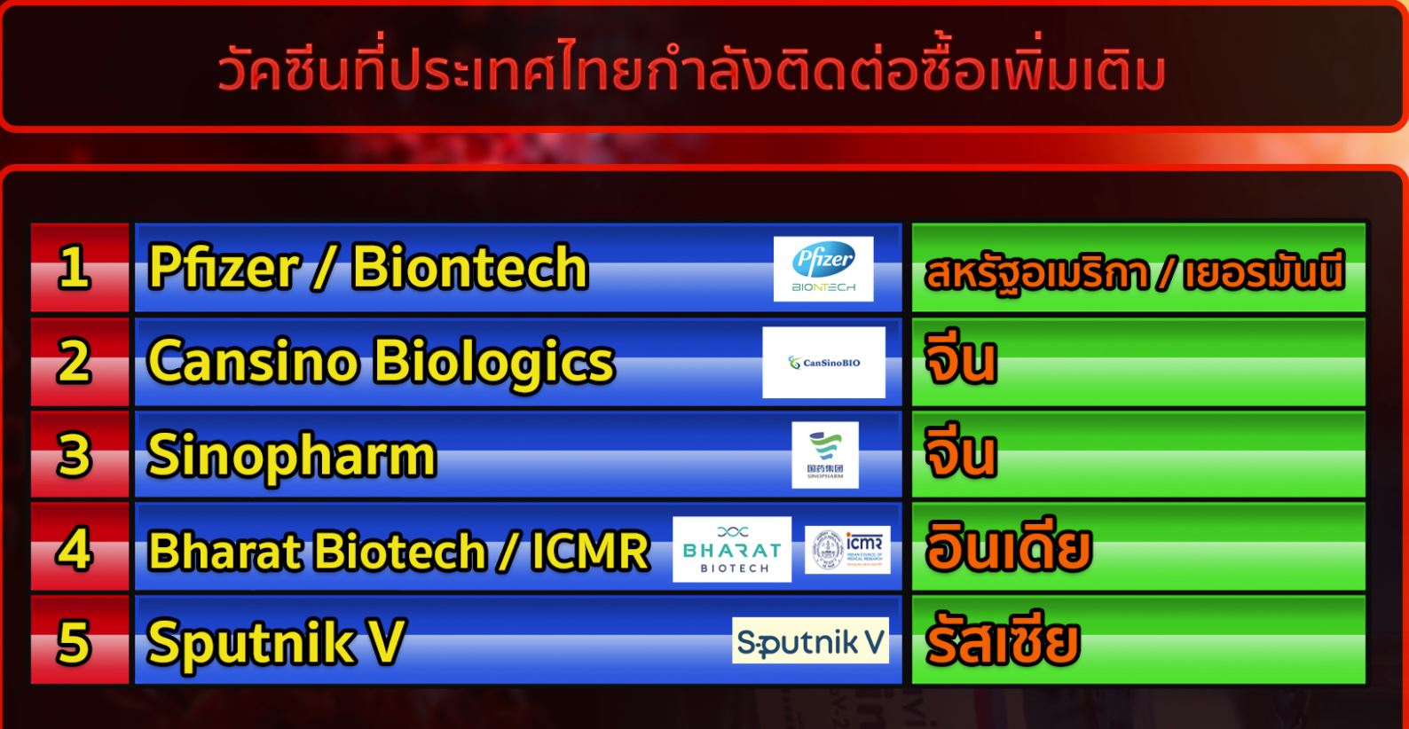 โดยสรุปวัคซีนที่กำลังเจรจาซื้อเพิ่มมี 5 บริษัท คือ วัคซีนที่ประเทศไทยกำลังติดต่อซื้อเพิ่มเติม