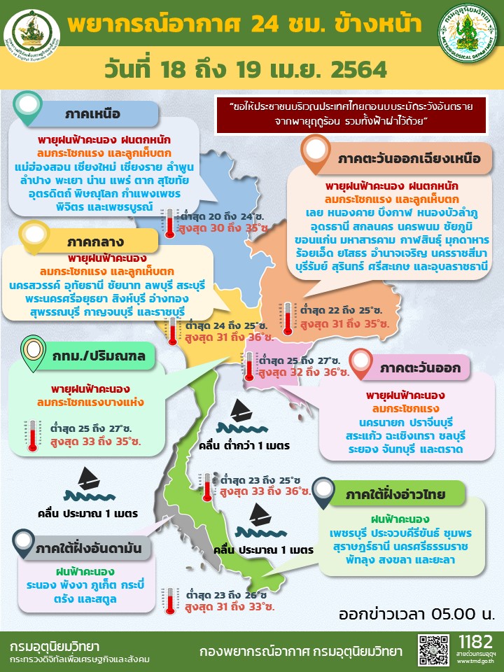 กรุงเทพฯ 18 เม.ย.-อุตุฯ เตือนพายุฤดูร้อนทั่วไทย ภาคเหนือ ภาคตะวันออกเฉียงเหนือ ภาคตะวันออก และภาคกลาง ฝนฟ้าคะนอง ลมแรง ลูกเห็บตก ระวังอันตรายจากฟ้าผ่า