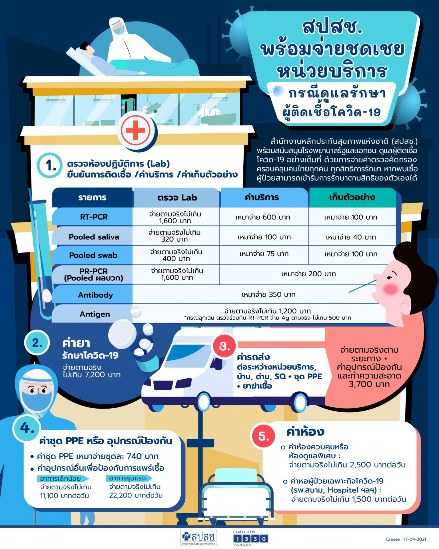 และ 4.การตรวจเชื้อไวรัส (Antigen) สำหรับหน่วยบริการที่ทำการตรวจคัดกรองและตรวจยืนยันเชื้อโควิด-19 นี้ ต้องผ่านการทดสอบความชำนาญทางห้องปฏิบัติการและได้รับการรับรองมาตรฐานจากกรมวิทยาศาสตร์การแพทย์ จ่ายตามจริงไม่เกิน 1,200 บาท โดยในกรณีฉุกเฉินตรวจร่วมกับ RT-PCR กำหนดจ่ายตามจริงไม่เกิน 500 บาท