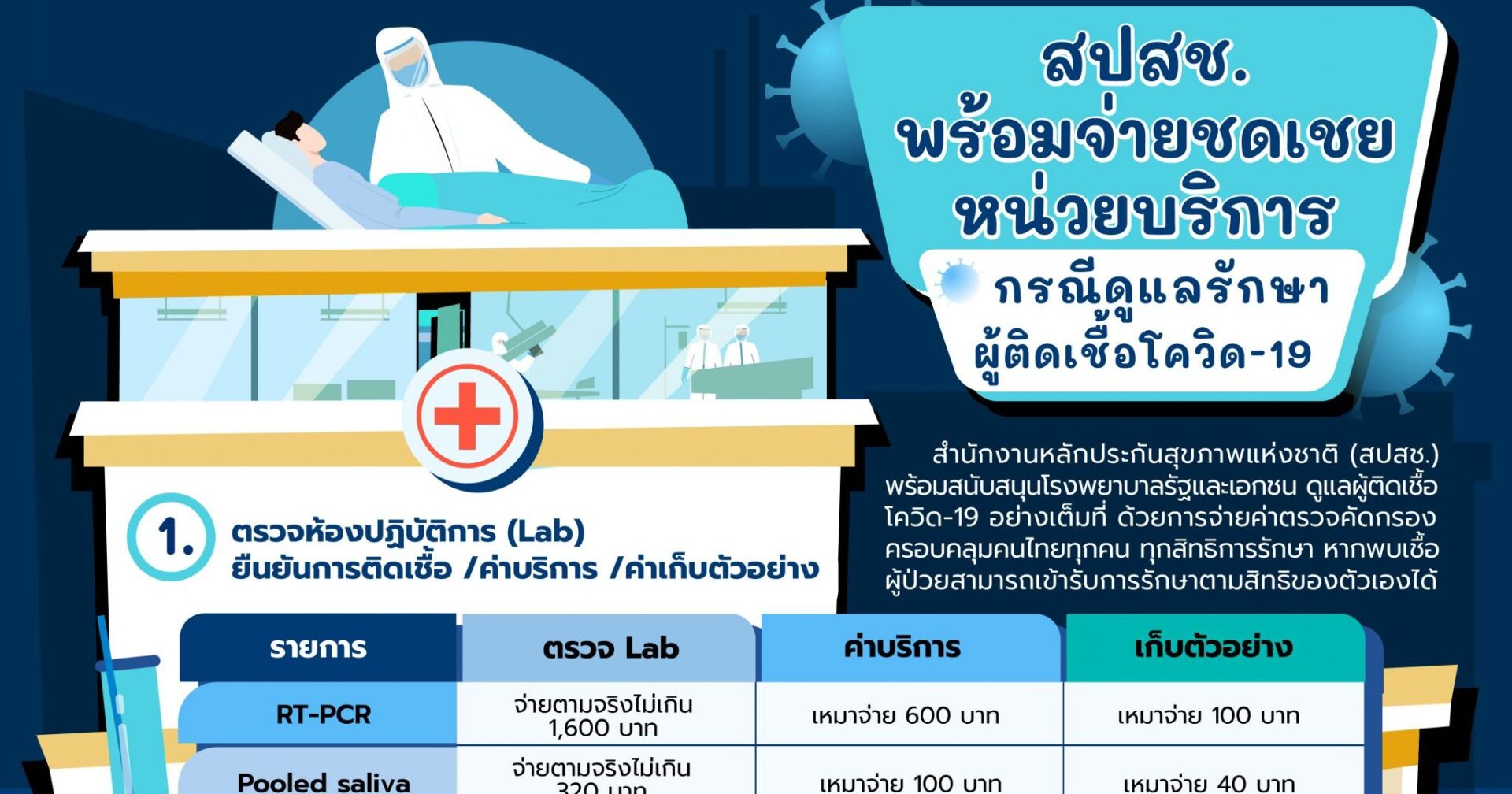 1.การตรวจด้วยวิธี RT-PCR โดยการทำป้ายหลังโพรงจมูกและลำคอ อัตราเบิกจ่ายค่าตรวจแลปจ่ายตามจริงไม่เกิน 1,600 บาท ค่าบริหารเหมาจ่าย 600 บาท ค่าเก็บตัวอย่างเหมาจ่าย 100 บาท