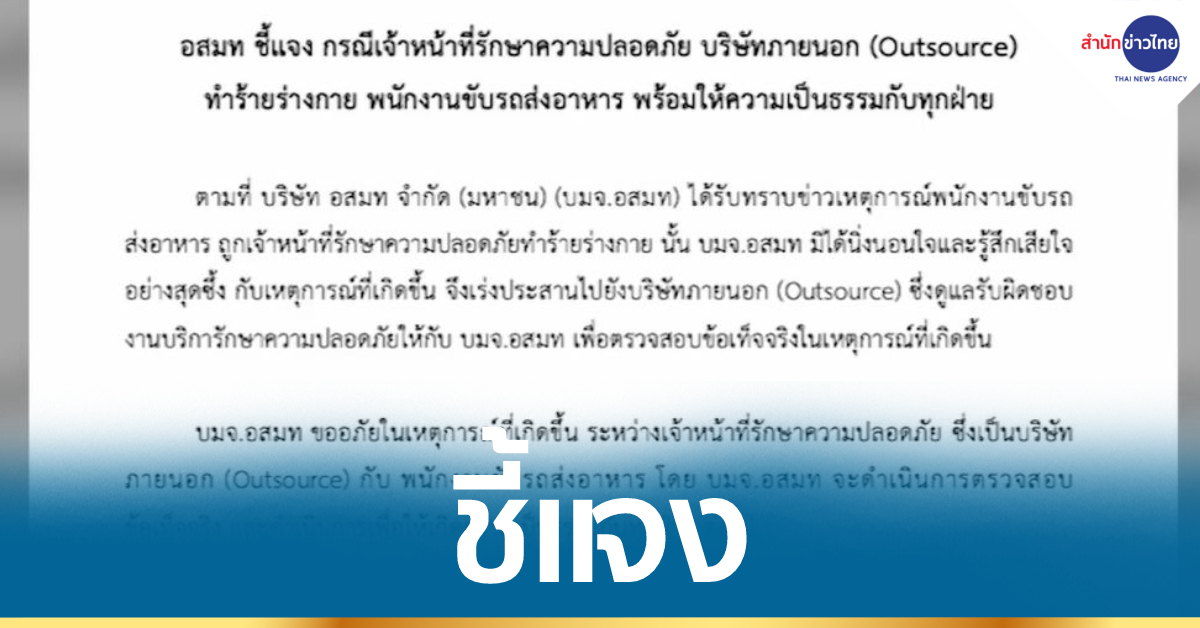 ตามที่บริษัท อสมท จำกัด (มหาชน) หรือ บมจ.อสมท ได้รับทราบข่าวเหตุการณ์พนักงานขับรถส่งอาหารถูกเจ้าหน้าที่รักษาความปลอดภัยทำร้ายร่างกายนั้น บมจ.อสมท มิได้นิ่งนอนใจและรู้สึกเสียใจอย่างสุดซึ้งกับเหตุการณ์ที่เกิดขึ้น จึงเร่งประสานไปยังบริษัทภายนอก (Outsource) ซึ่งดูแลรับผิดชอบงานบริการักษาความปลอดภัยให้กับ บมจ.อสมท เพื่อตรวจสอบข้อเท็จจริงในเหตุการณ์ที่เกิดขึ้น