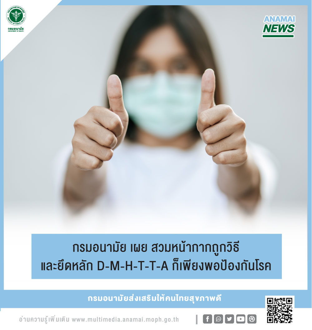 กรมอนามัย 21เม.ย.-กรมอนามัยเผยประชาชนสามารถป้องกันตนเองจากเชื้อโควิดด้วยการสวมหน้ากาก ไม่จำเป็นต้องสวมทับสองชั้น แต่ต้องสวมถูกวิธี เมื่อออกนอกบ้าน พร้อมย้ำยึดหลักปฏิบัติตามมาตรการป้องกัน D-M-H-T-T-A อย่างเคร่งครัด