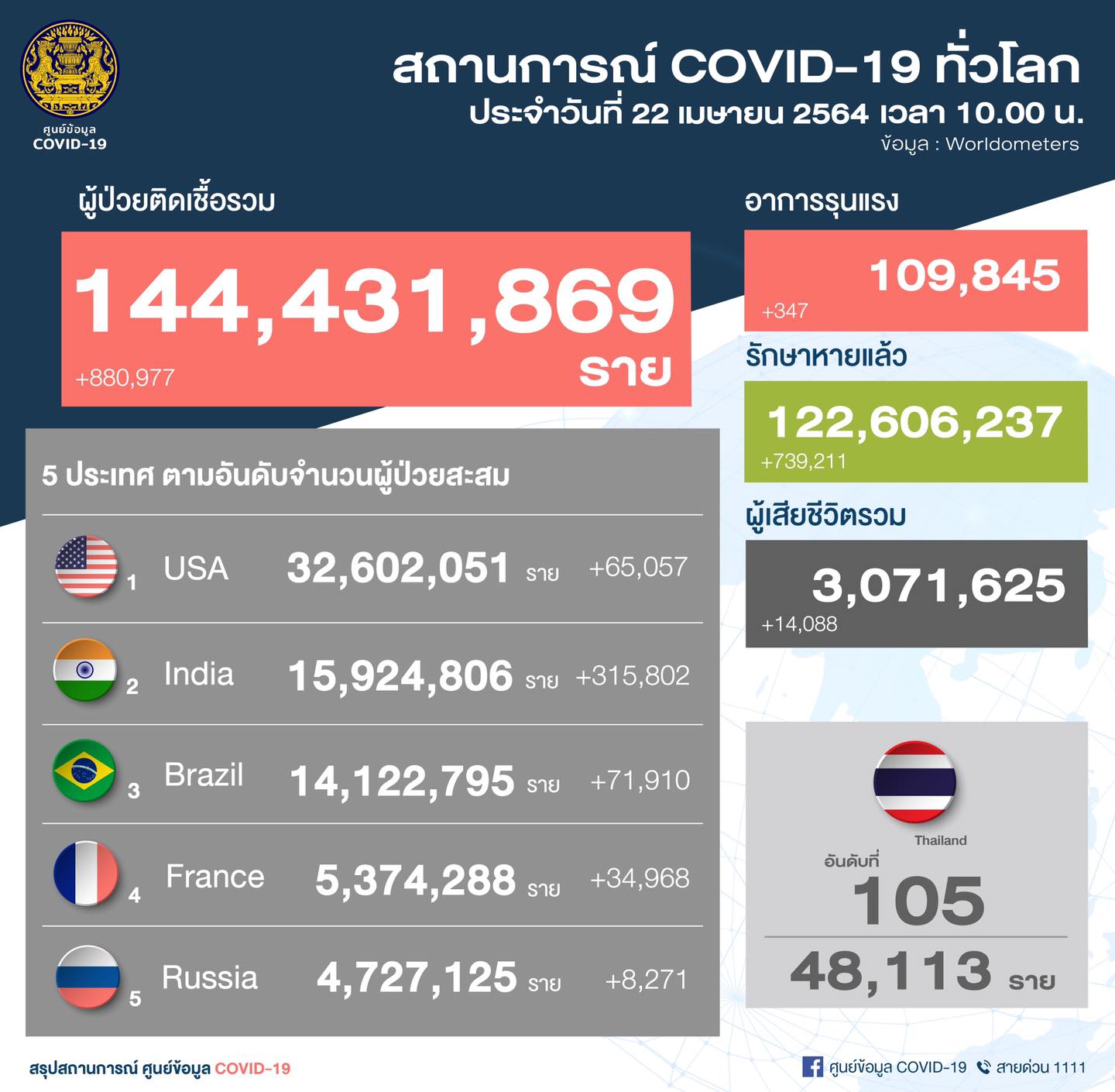 สถานการณ์ Covid-19 ในต่างประเทศ ประจำวันที่ 22 เม.ย.64