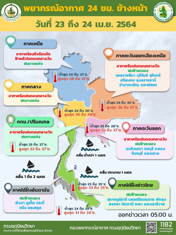 กรมอุตุนิยมวิทยา พยากรณ์อากาศ 24 ชั่วโมงข้างหน้า ประเทศไทยมีอากาศร้อนถึงร้อนจัดในตอนกลางวัน กับมีฝนฟ้าคะนองบางแห่ง เนื่องจากความกดอากาศต่ำจากความร้อนปกคลุมประเทศไทยตอนบน ประกอบกับลมตะวันตกเฉียงใต้ยังคงพัดนำความชื้นจากทะเลอันดามันและอ่าวไทย เข้ามาปกคลุมภาคตะวันออกเฉียงเหนือ ภาคกลาง ภาคตะวันออก รวมทั้งกรุงเทพมหานคร และปริมณฑล ขอให้ประชาชนบริเวณประเทศไทยตอนบนดูแลรักษาสุขภาพ เนื่องจากสภาพอากาศที่ร้อนถึงร้อนจัดไว้ด้วย ส่วนลมตะวันตกพัดปกคลุมทะเลอันดามัน ภาคใต้และอ่าวไทย ทำให้ภาคใต้มีฝนฟ้าคะนองเกิดขึ้นในระยะนี้