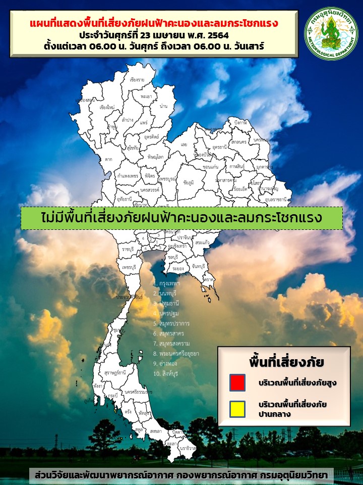 อนึ่ง ในช่วงวันที่ 26-29 เม.ย.64 ภาคเหนือ ภาคตะวันออกเฉียงเหนือ ภาคกลาง ภาคตะวันออก รวมทั้งกรุงเทพมหานคร และปริมณฑล จะมีพายุฤดูร้อนเกิดขึ้น โดยมีลักษณะของพายุฝนฟ้าคะนอง ลมกระโชกแรง ลูกเห็บตก และอาจมีฟ้าผ่าเกิดขึ้นได้ โดยมีฝนตกหนักบางแห่ง เนื่องจากบริเวณความกดอากาศสูงระลอกใหม่จากประเทศจีนจะแผ่ลงมาปกคลุมภาคตะวันออกเฉียงเหนือของประเทศไทยและทะเลจีนใต้ ทำให้มีลมตะวันออกเฉียงใต้และลมใต้พัดนำความชื้นจากทะเลจีนใต้และอ่าวไทยเข้ามาปกคลุมประเทศไทยตอนบน