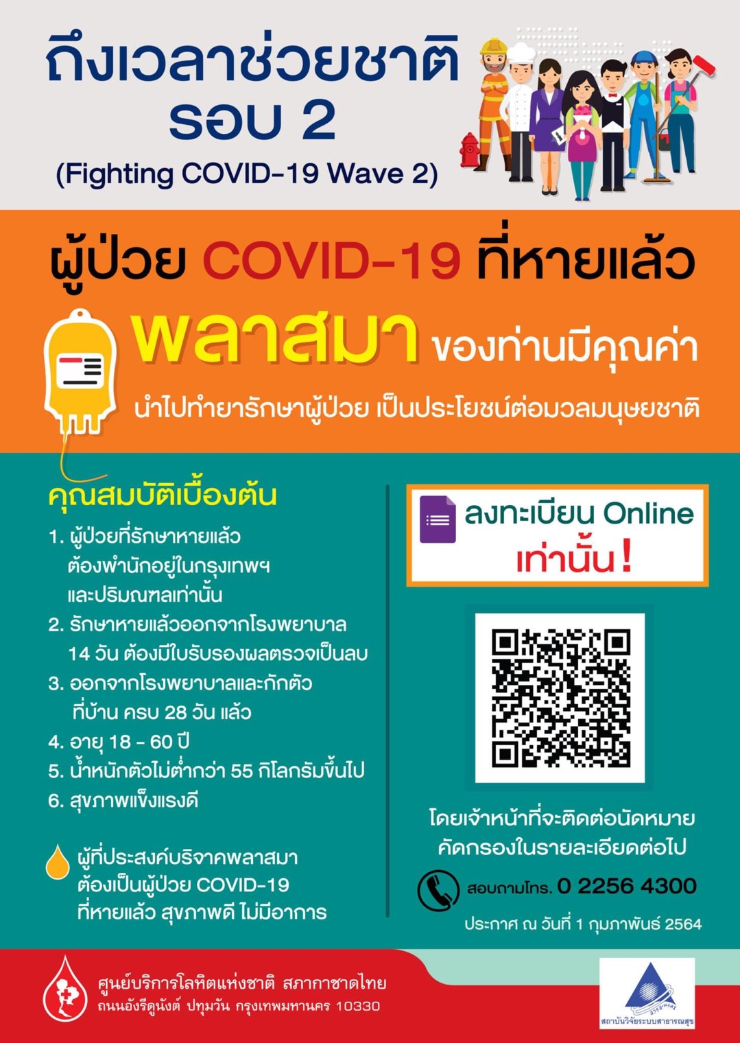 ถึงเวลาช่วยชาติ รอบ 2 ขอเชิญผู้ป่วยโรคโควิด-19 ที่หายแล้ว สุขภาพแข็งแรงดี มาบริจาคพลาสมาเพื่อใช้เสริมการรักษาโรคให้แก่ผู้ป่วยที่มีอาการหนัก สามารถลงทะเบียนออนไลน์ ได้ที่ Facebook fanpage ศูนย์บริการโลหิตแห่งชาติ สภากาชาดไทย โดยจะมีเจ้าหน้าที่ติดต่อกลับไปนัดหมายคัดกรองในรายละเอียดต่อไป สอบถามโทร. 0 2256 4300