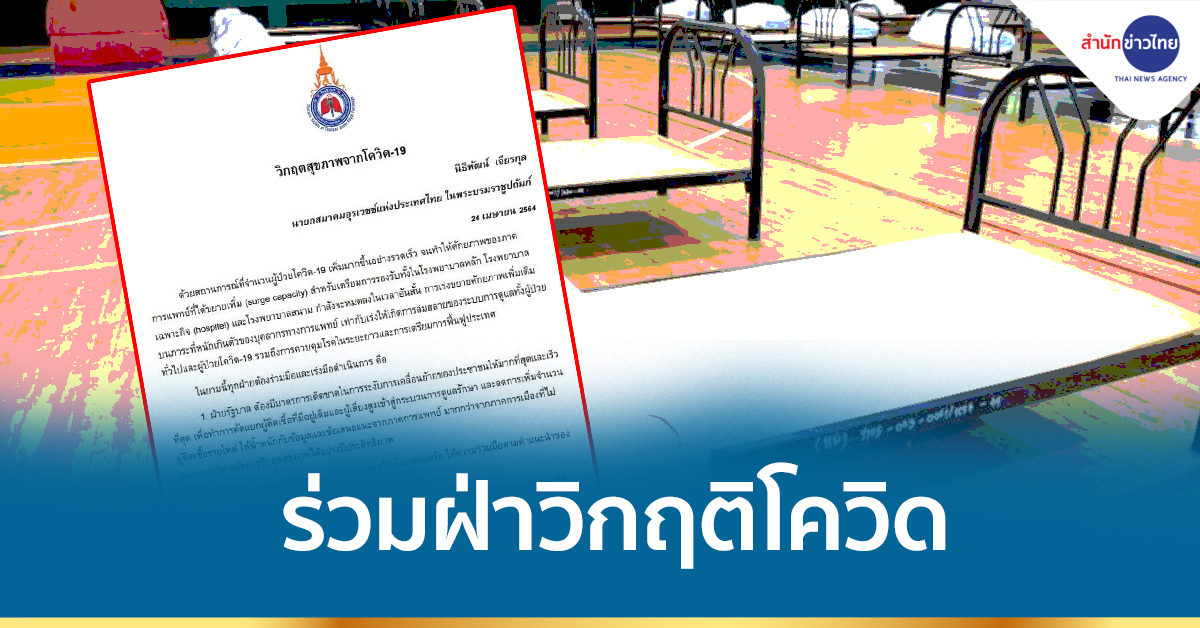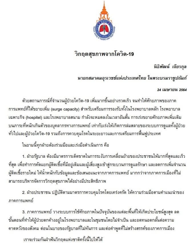 24 เม.ย.-สมาคมอุรเวชฯ เรียกร้องความร่วมมือทุกฝ่ายฝ่าวิกฤติโควิด ชี้รัฐออกมาตรการห้ามเคลื่อนย้ายของประชาชน ประชาชนต้องปฏิบัติตามมาตรการ การแพทย์ต้องสาวระบบให้ดี และอดทนต่อคำพูดไม่สร้างสรรค์ของภาคการเมือง