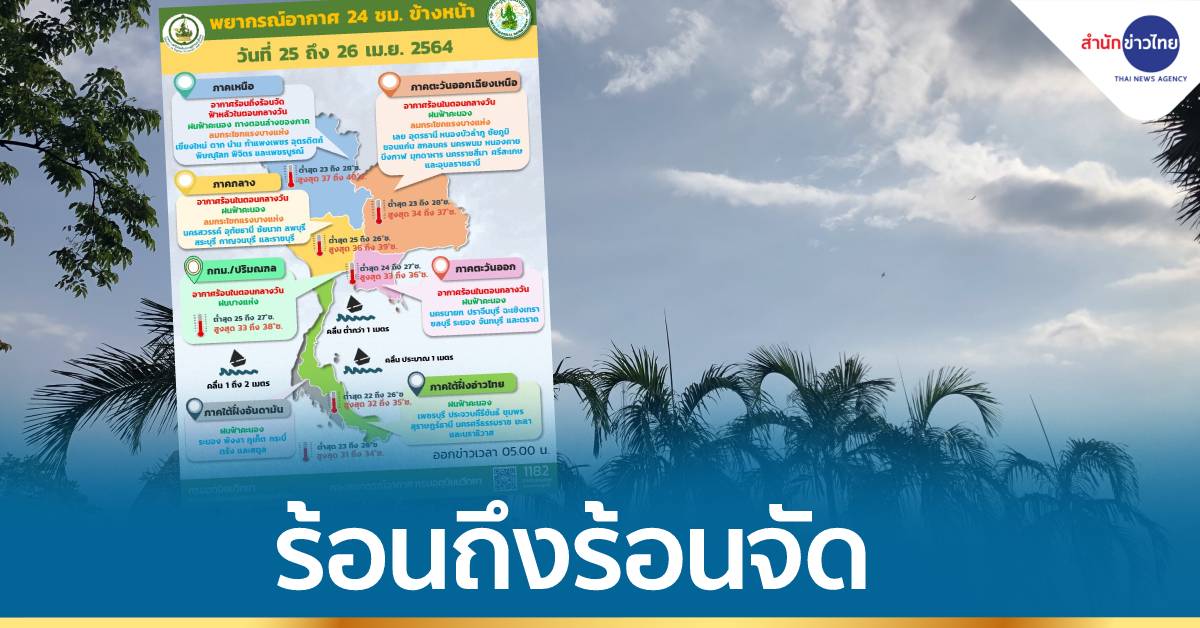 กทม. 25 เม.ย.-กรมอุตุฯ เผยประเทศไทย มีอากาศร้อนถึงร้อนจัดในตอนกลางวัน กับมีฝนฟ้าคะนองบางแห่ง เตือนพายุฤดูร้อน ไทยตอนบน ช่วงวันที่ 26-30 เม.ย.64