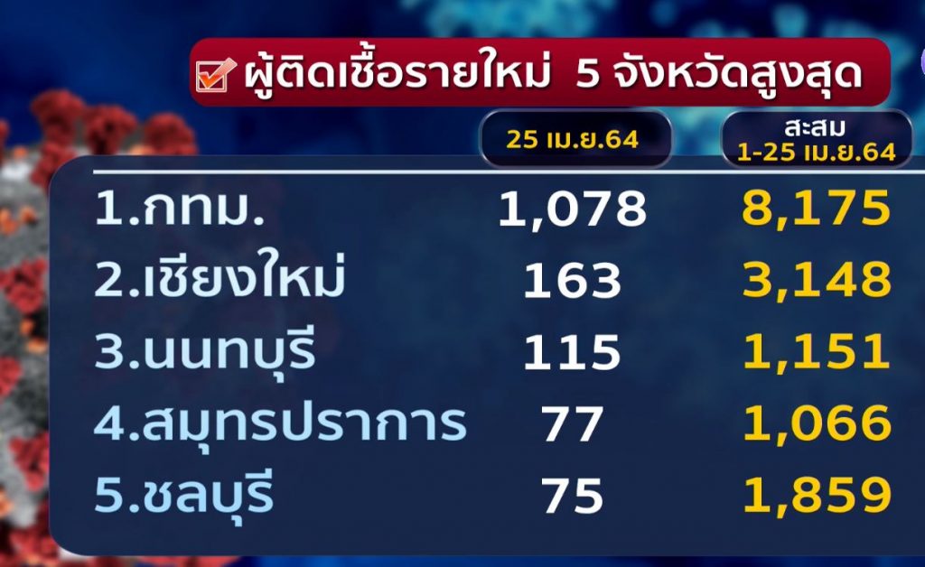 พื้นที่ที่พบมีผู้ติดเชื้อรายใหม่สะสมสูงสุดในระลอกเดือนเมษายน (1-25เม.ย.64) 5 จังหวัดสูงสุด ได้แก่ กทม. 8,175 คน รองลงมา เชียงใหม่ 3,148 คน นนทบุรี 1,151 คน สมุทรปราการ 1,066 คน และชลบุรี 1,859 คน