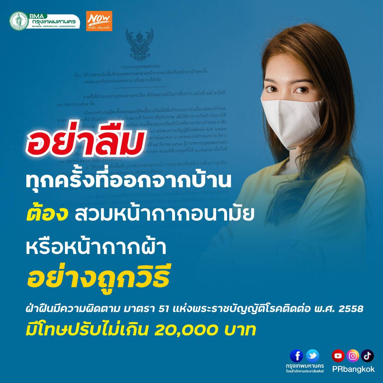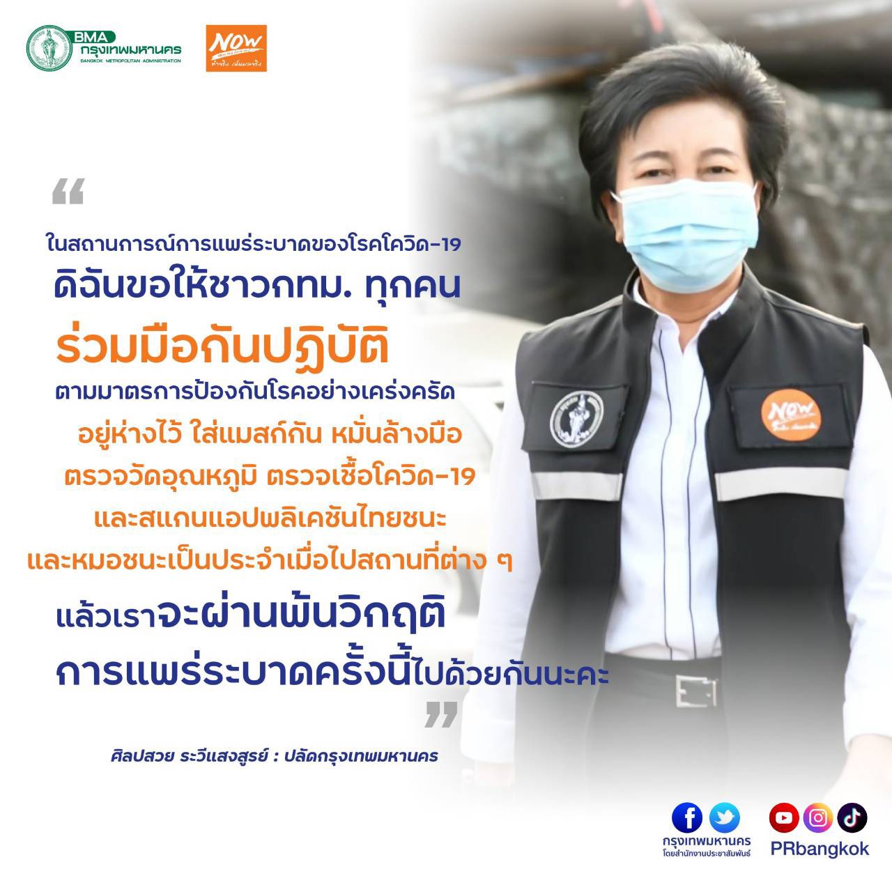 นางศิลปสวย ระวีแสงสูรย์ ปลัดกรุงเทพมหานคร (ปลัด กทม.) เปิดเผยว่า ตามที่ประชาชนและสื่อมวลชนมีข้อสงสัยกรณีการบังคับให้ใส่หน้ากาก ตามประกาศกรุงเทพมหานคร เรื่องให้ประชาชนในพื้นที่กรุงเทพมหานครสวมหน้ากากอนามัยหรือหน้ากากผ้าทุกครั้งตลอดเวลาที่ออกนอกเคหสถาน หรือสถานที่พำนักนั้น โดยเจตนาในการประกาศคือการป้องกันการติดต่อของโรคจากบุคคลไปสู่บุคคล การอยู่ร่วมกับบุคคลอื่นในอาคารหรือที่ต่าง ๆ จะต้องสวมหน้ากาก สำหรับในที่สาธารณะต้องใส่ตลอดเวลาไม่ว่าจะอยู่คนเดียวหรือไม่ เพราะบุคคลอื่นอาจมาใช้สถานที่นั้นต่อ