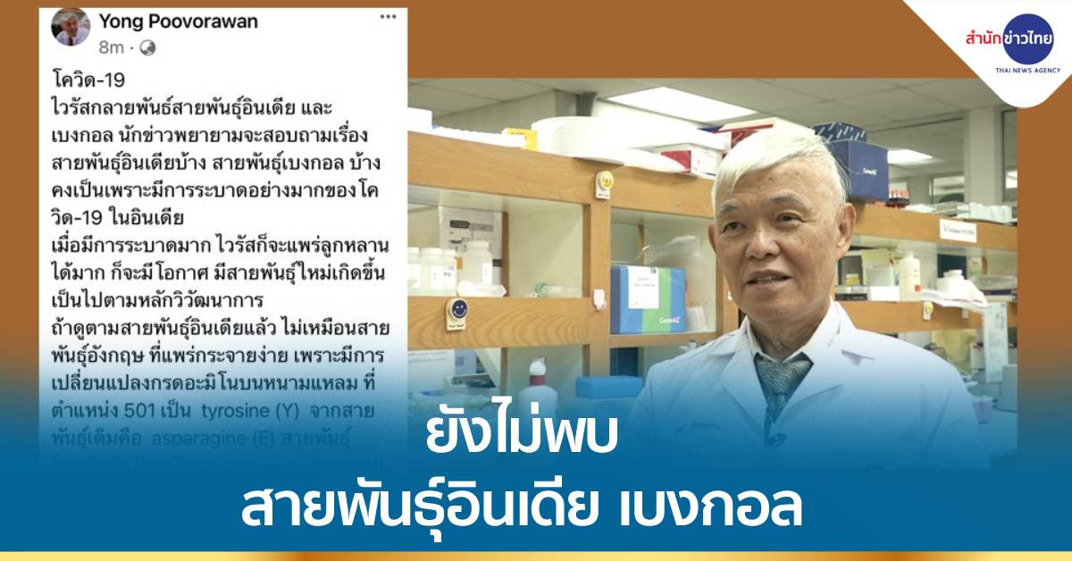 ศ.นพ.ยง ภู่วรวรรณ หรือ “หมอยง” หัวหน้าศูนย์เชี่ยวชาญเฉพาะทางด้านไวรัสวิทยาคลินิก ภาควิชากุมารเวชศาสตร์ คณะแพทยศาสตร์ จุฬาลงกรณ์มหาวิทยาลัย โพสต์เฟซบุ๊กYong Poovorawan ว่า โควิด-19 ไวรัสกลายพันธ์สายพันธุ์อินเดีย และเบงกอล นักข่าวพยายามจะสอบถามเรื่องสายพันธุ์อินเดียบ้าง สายพันธุ์เบงกอลบ้าง คงเป็นเพราะมีการระบาดอย่างมากของโควิด-19 ในอินเดีย