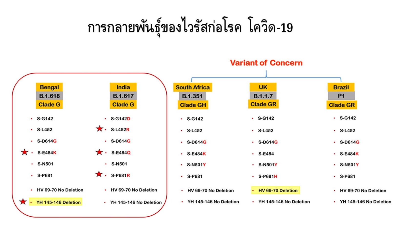 จากการตรวจสายพันธุ์โดยศูนย์เชี่ยวชาญเฉพาะทางด้านไวรัสวิทยาคลินิก จุฬาฯกว่า 500 ตัวอย่างที่มีการระบาดอยู่ณะนี้มากกว่า 98% ของเราเป็นสายพันธุ์อังกฤษ B.1.1.7 ยังไม่พบสายพันธุ์ อินเดีย เบงกอล อัฟริกาใต้ บราซิล ในประเทศไทย .-สำนักข่าวไทย
