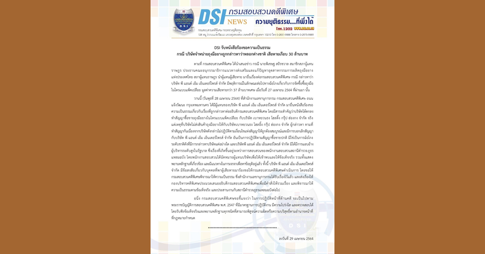 ดีเอสไอ 29 เม.ย.-ดีเอสไอรับหนังสือร้องขอความเป็นธรรมกรณีบริษัทจำหน่ายถุงมือยางถูกกล่าวหาว่าหลอกต่างชาติ เสียหายเกือบ30ล้านบาท
